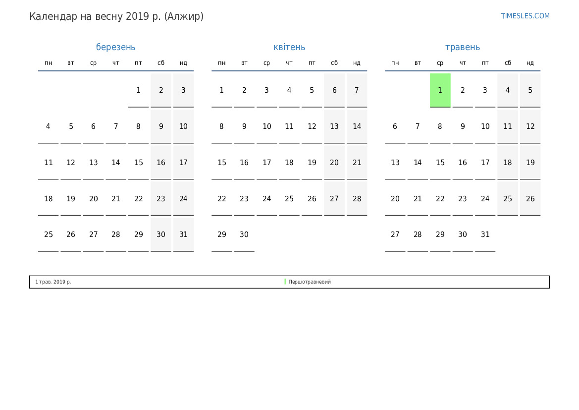 Календар на весну 2019 року для Алжиру