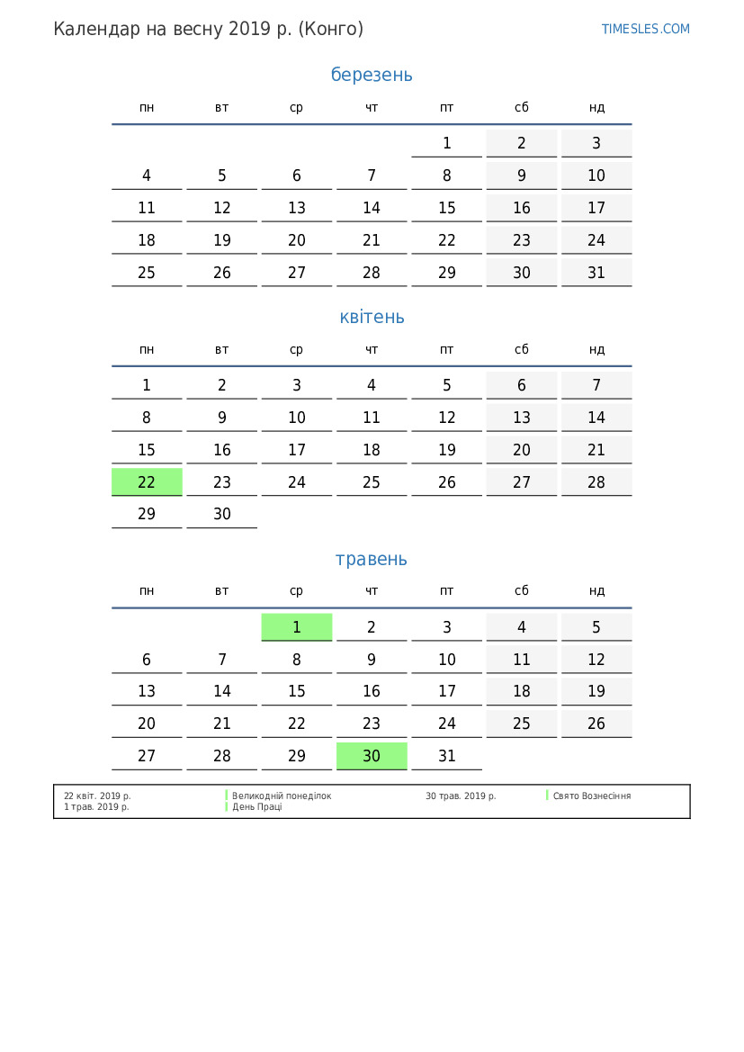 Завантажте та роздрукуйте календар PDF зі святами та вихідними на весну 2019 року для Конго
