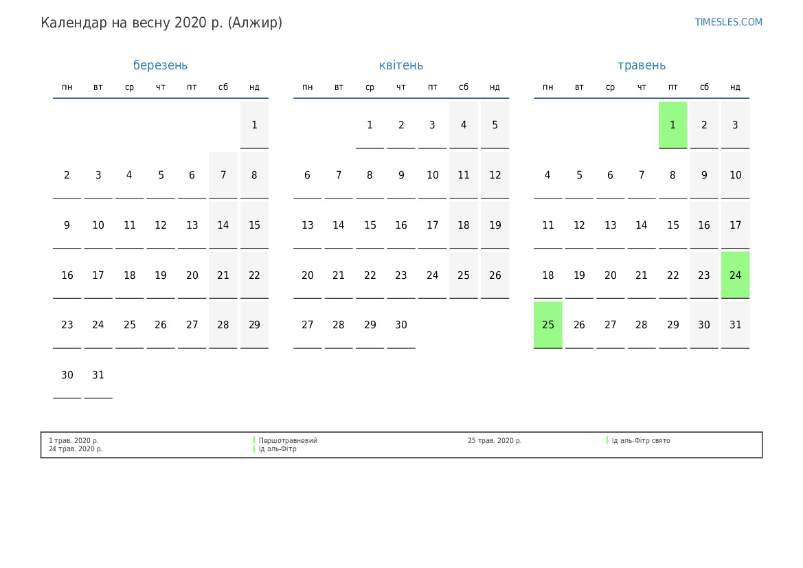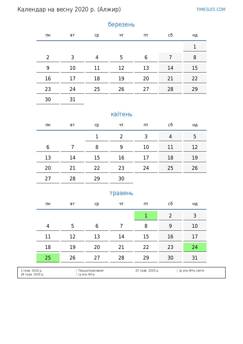 Завантажте та роздрукуйте календар PDF зі святами та вихідними на весну 2020 року для Алжиру