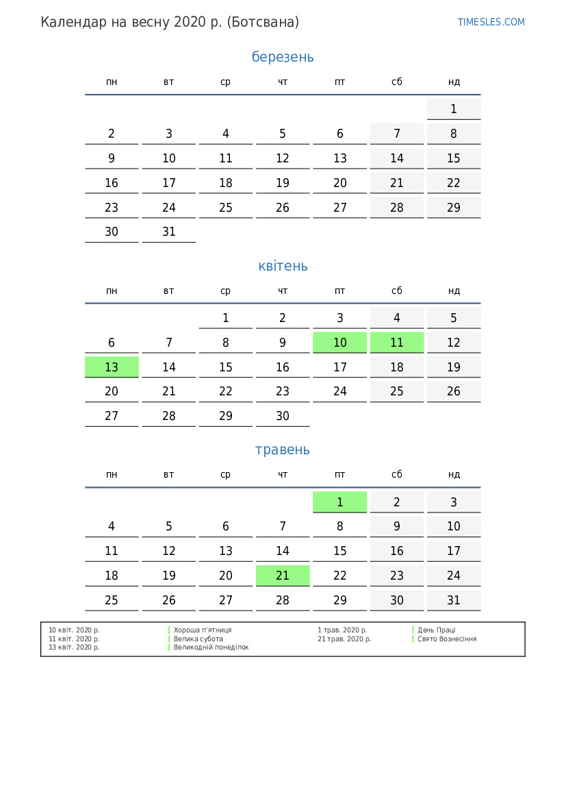 Завантажте та роздрукуйте календар PDF зі святами та вихідними на весну 2020 року для Ботсвани