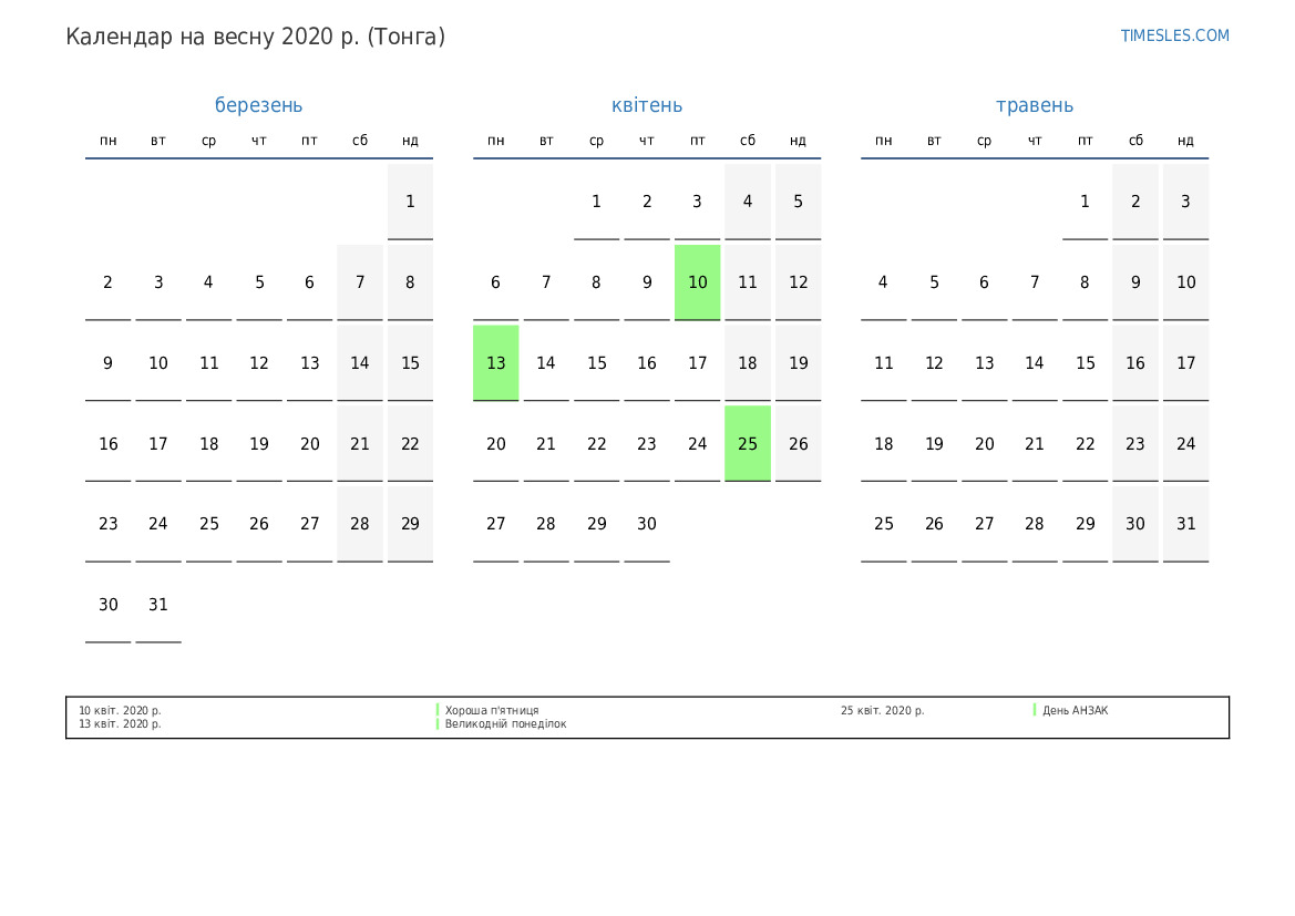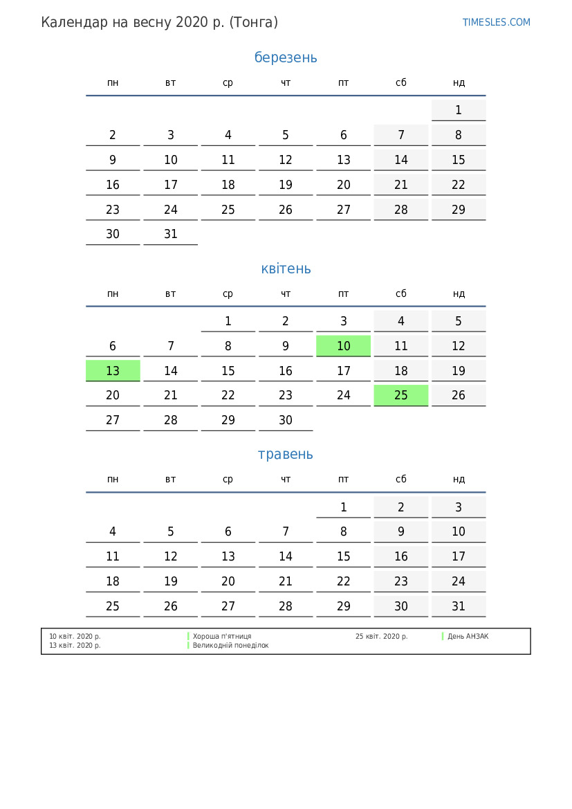Завантажте та роздрукуйте календар PDF зі святами та вихідними на весну 2020 року для Тонги