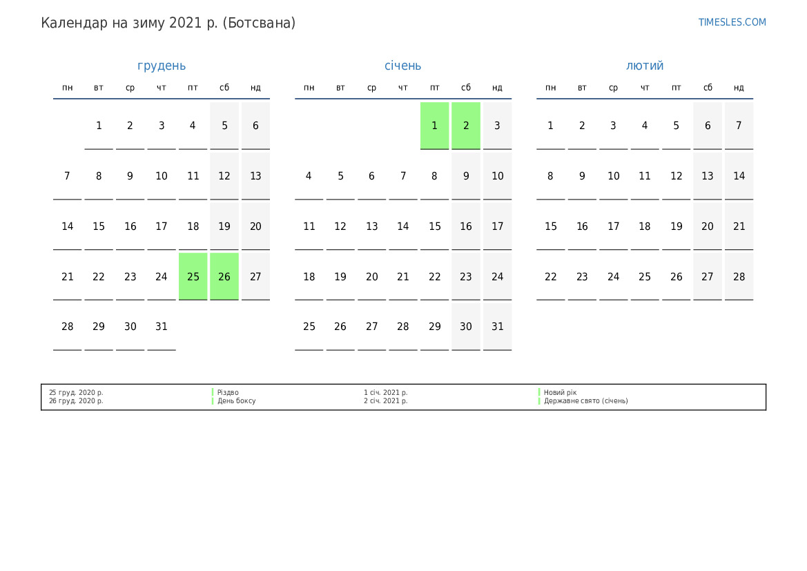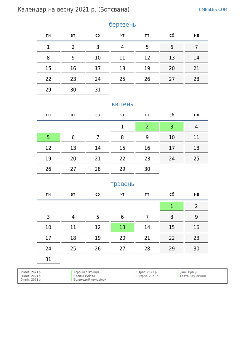 Завантажте та роздрукуйте календар PDF зі святами та вихідними на весну 2021 року для Ботсвани