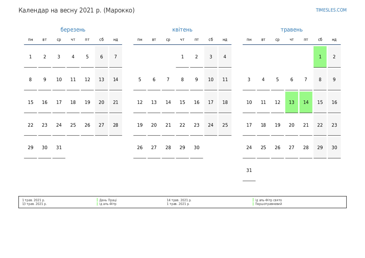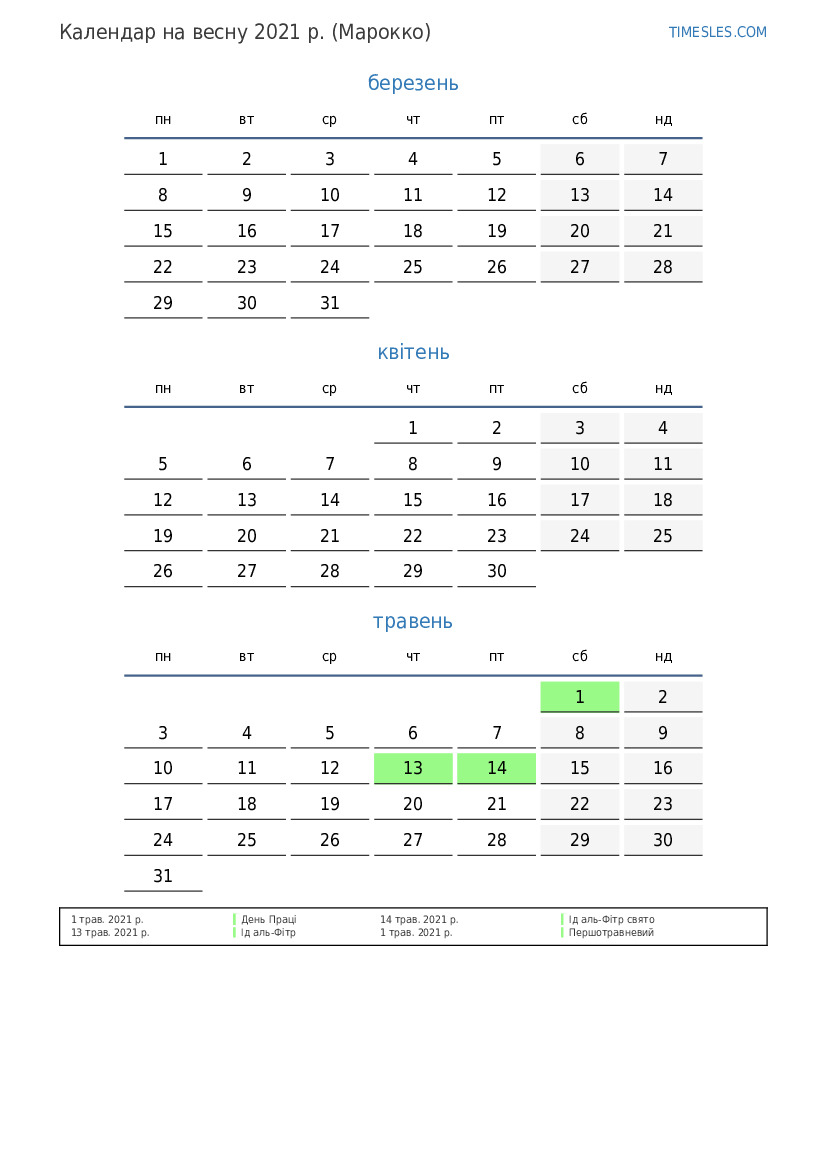 Завантажте та роздрукуйте календар PDF зі святами та вихідними на весну 2021 року для Марокко