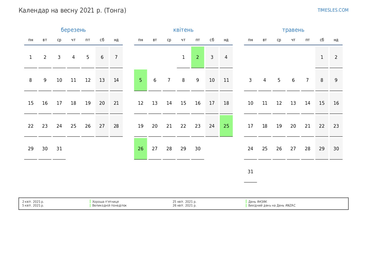 Завантажте та роздрукуйте календар PDF зі святами та вихідними на весну 2021 року для Тонги