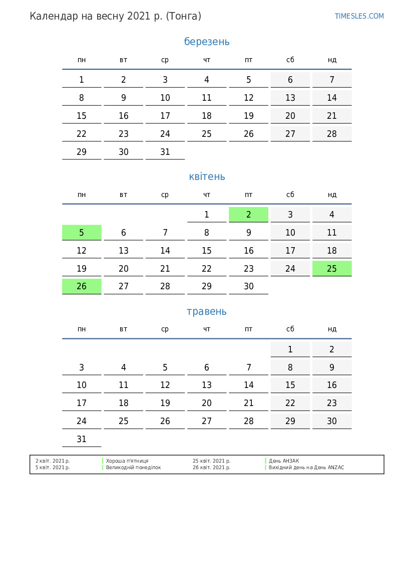 Календар на весну 2021 року для Тонги