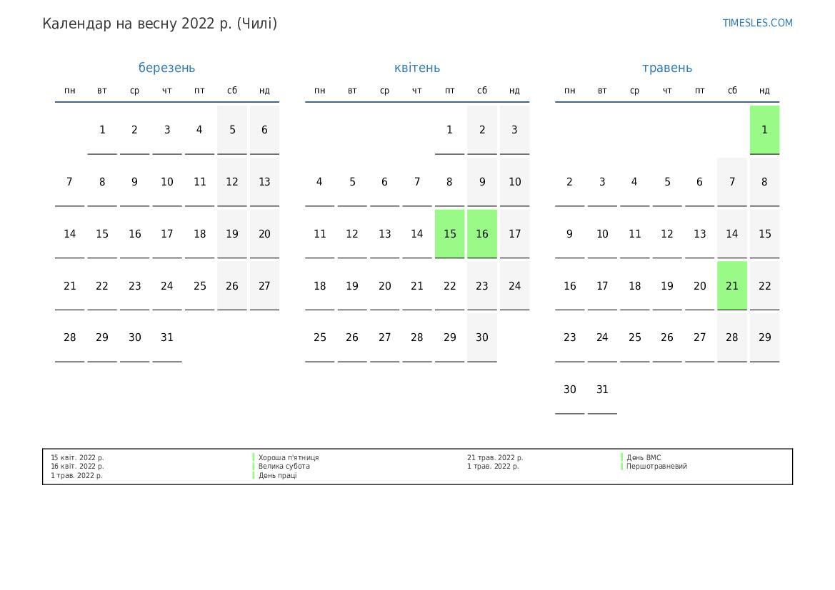 Завантажте та роздрукуйте календар PDF зі святами та вихідними на весну 2022 року для Чилі