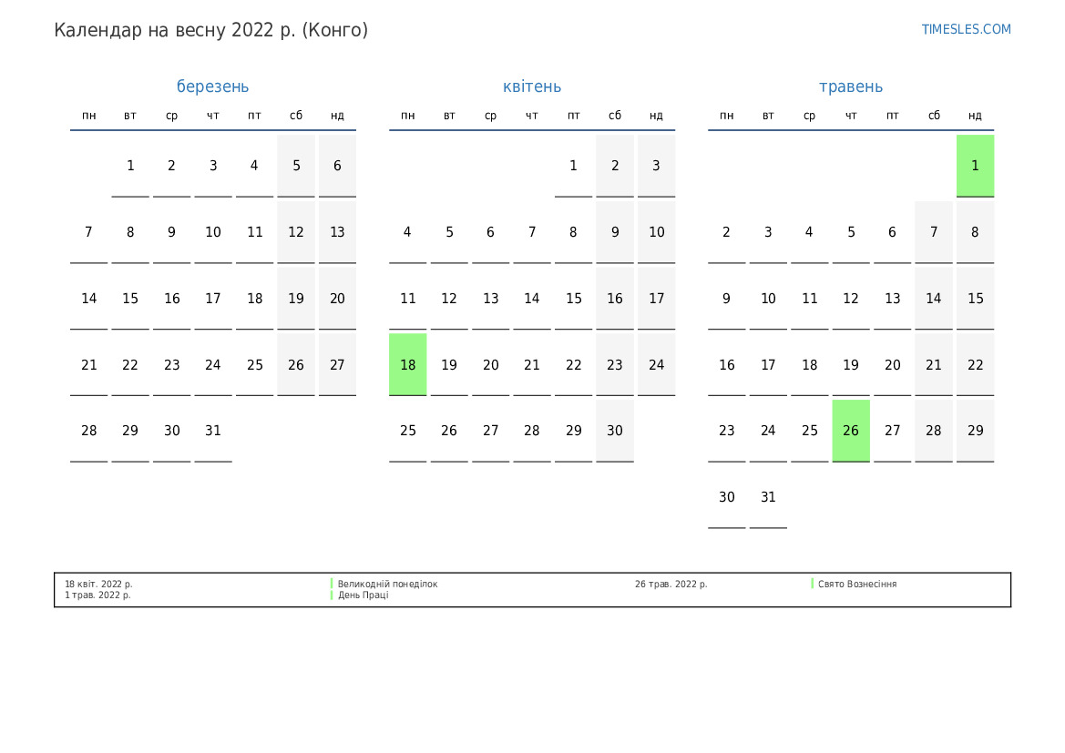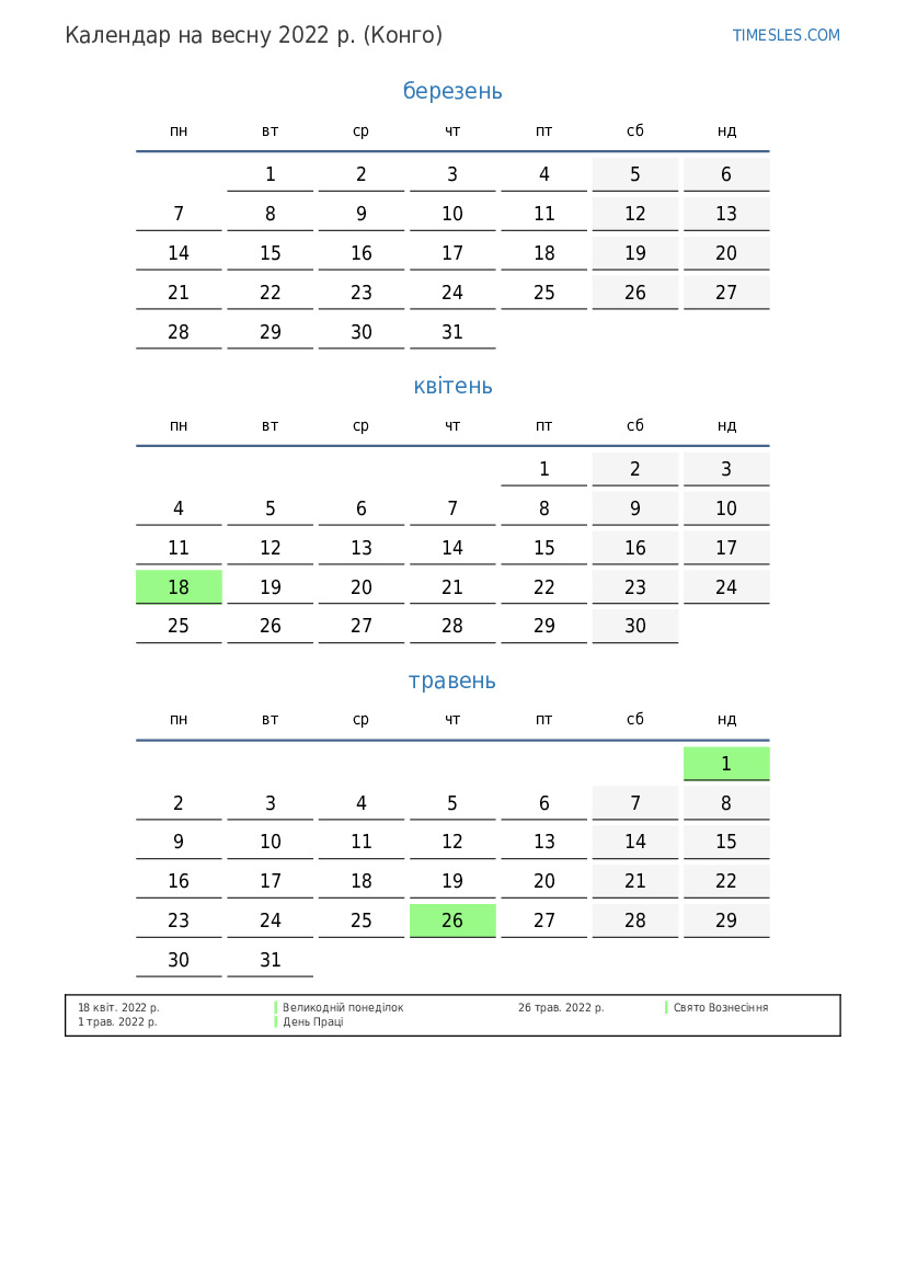 Завантажте та роздрукуйте календар PDF зі святами та вихідними на весну 2022 року для Конго