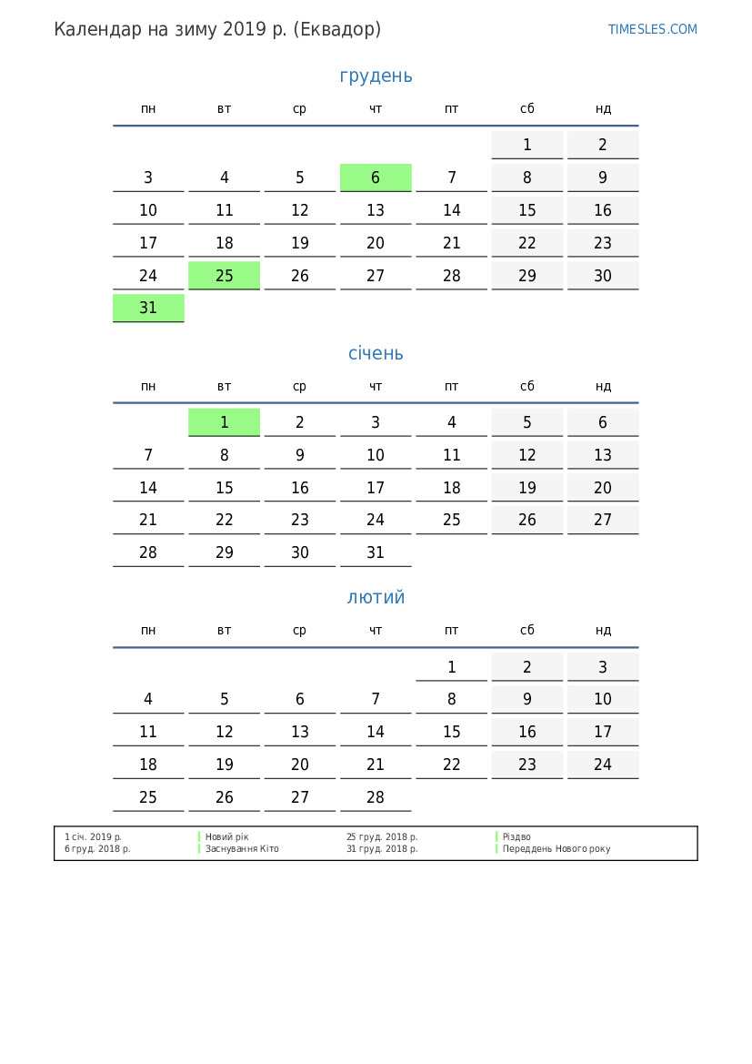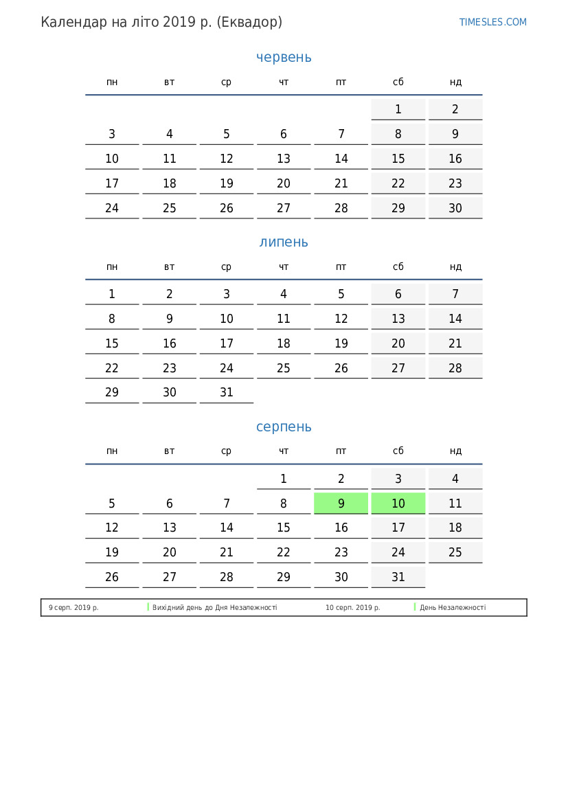Календар свят і вихідних на літо 2019 року для Еквадору