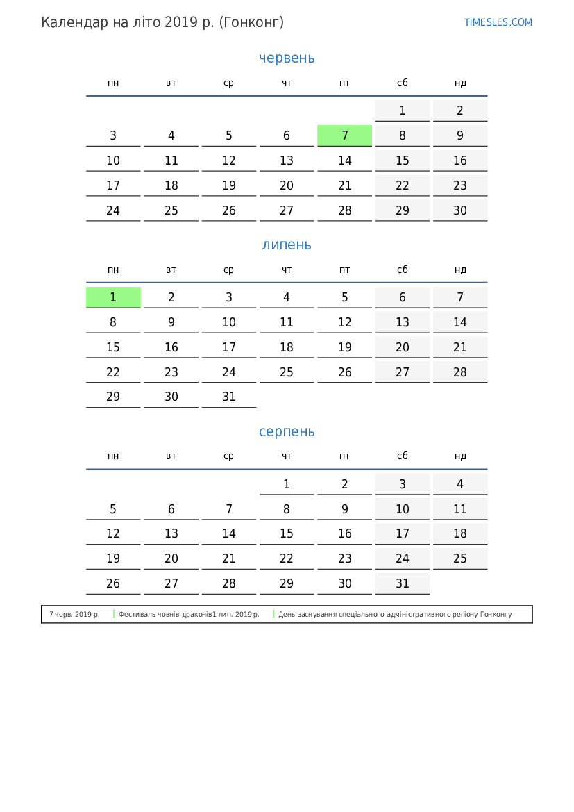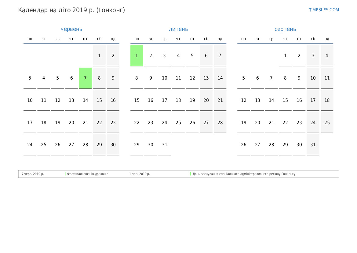 Календар на літо 2019 року для Гонконгу