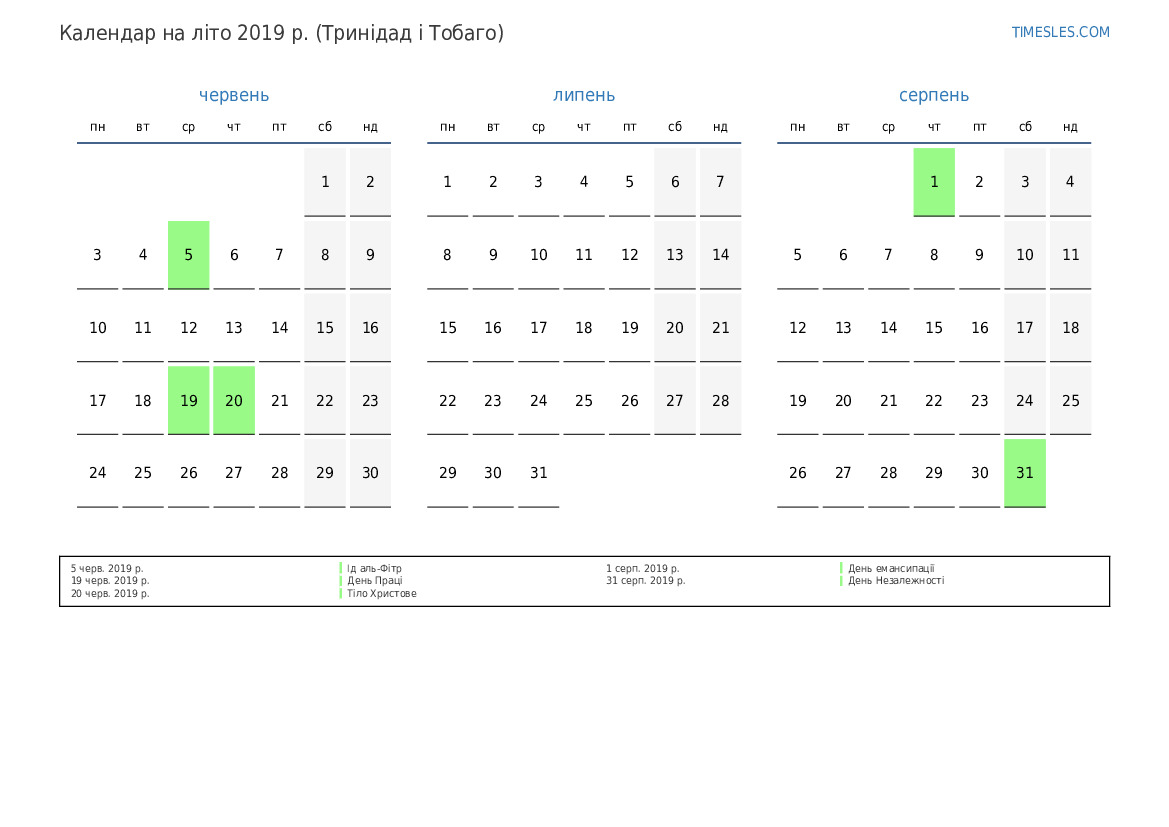 Календар на літо 2019 року для Тринідаду та Тобаго