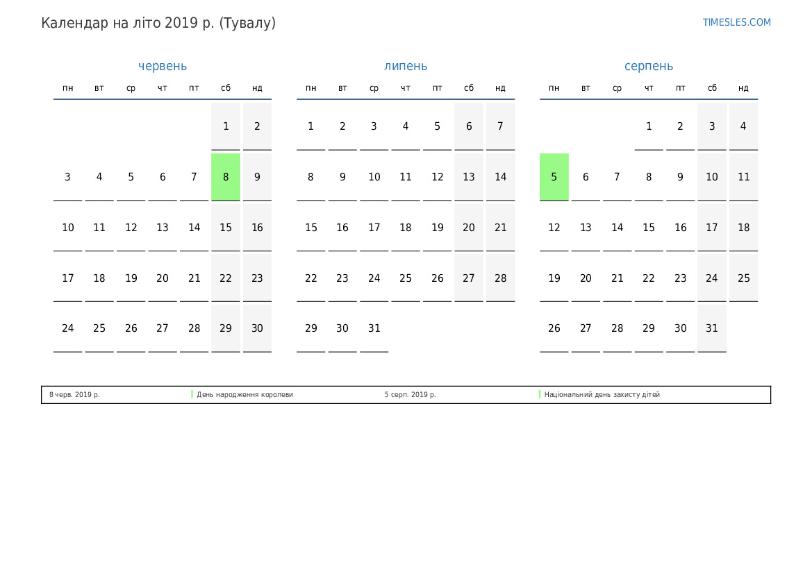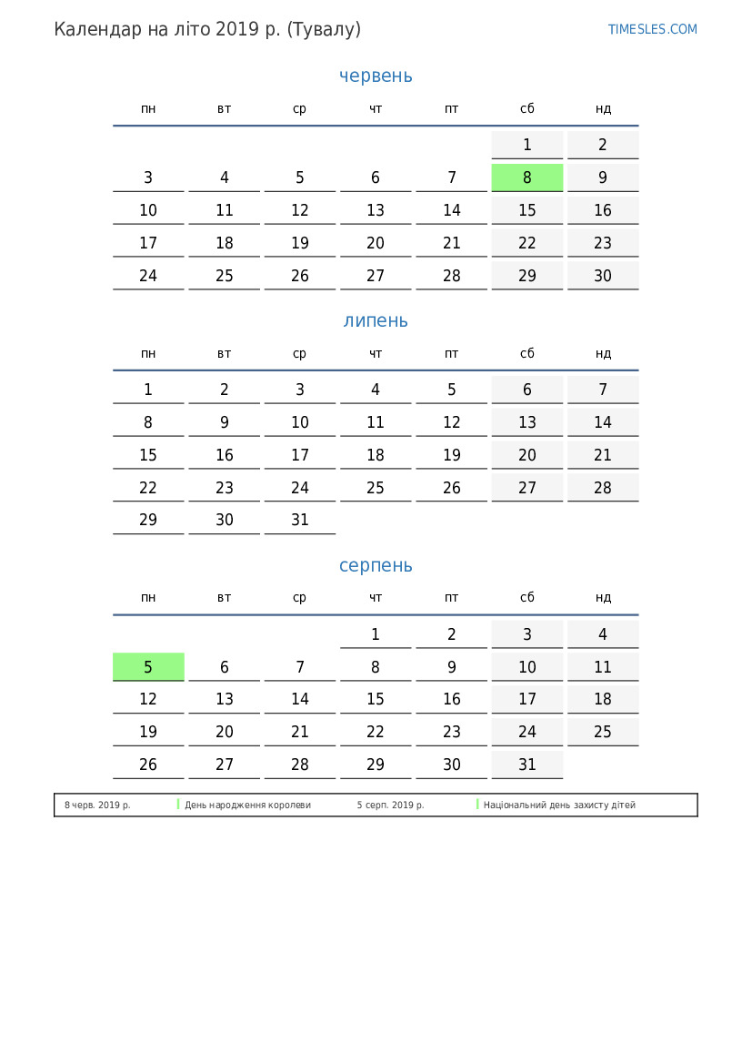 Завантажте та роздрукуйте календар PDF зі святами та вихідними на літо 2019 року для Тувалу