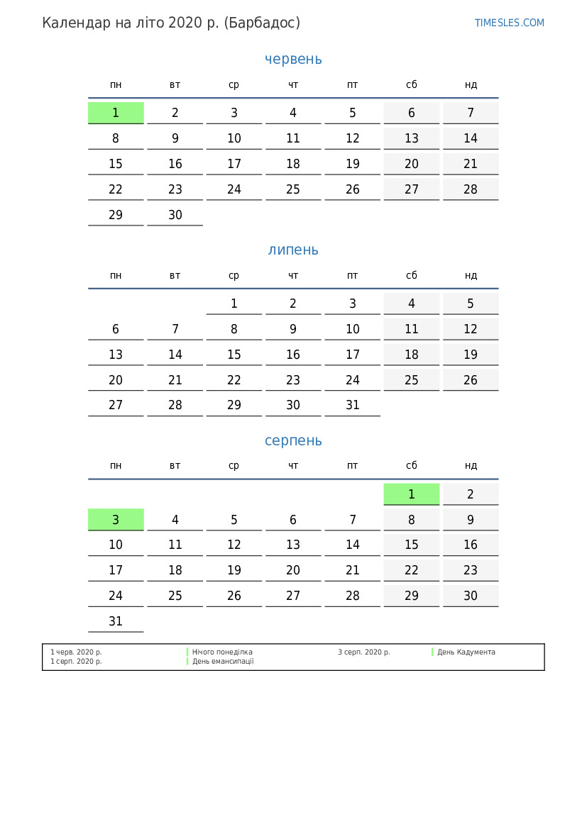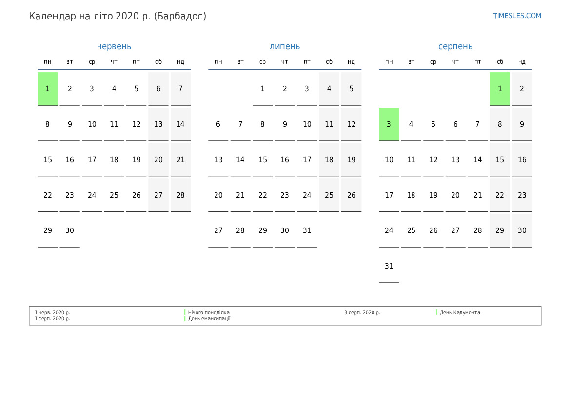 Календар на літо 2020 року для Барбадосу