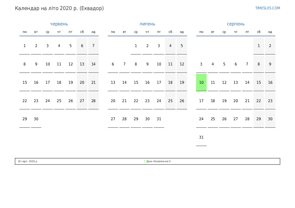 Завантажте та роздрукуйте календар PDF зі святами та вихідними на літо 2020 року для Еквадору