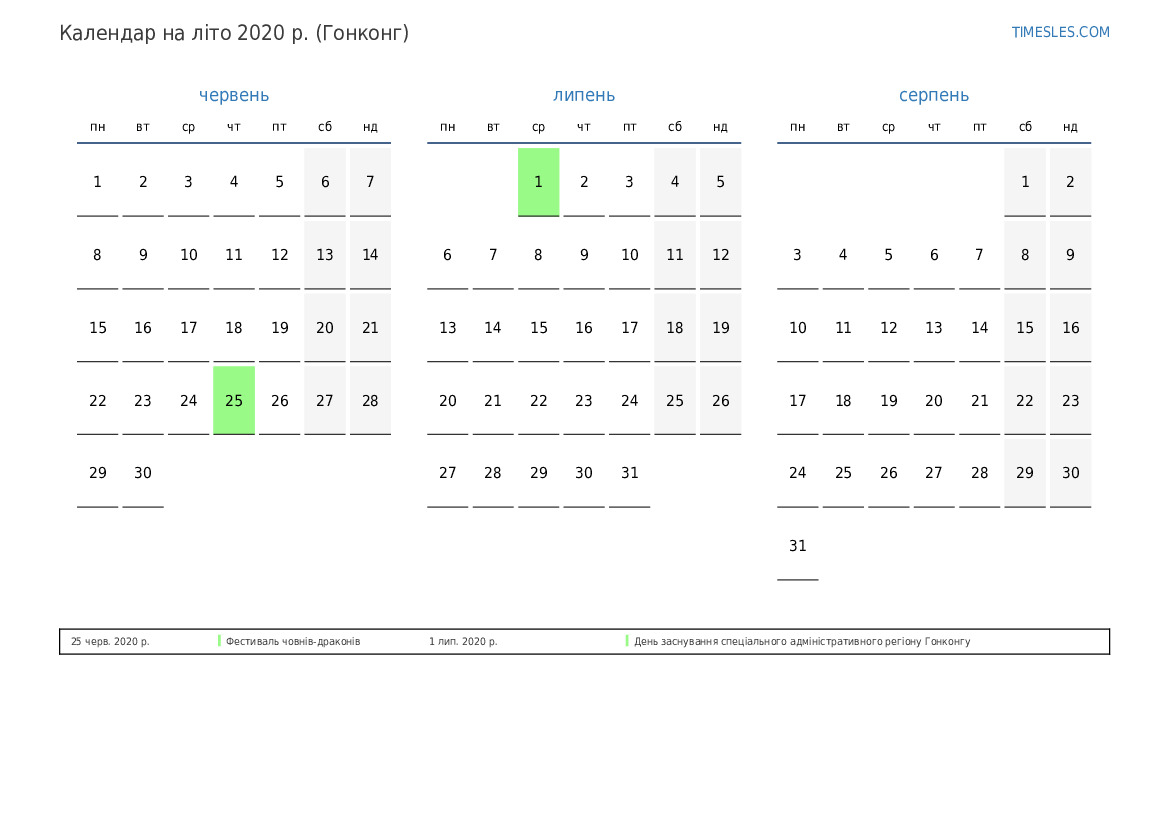 Календар на літо 2020 року для Гонконгу