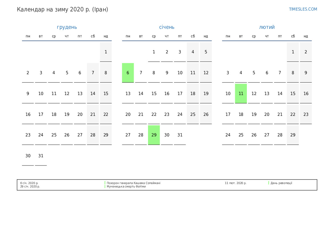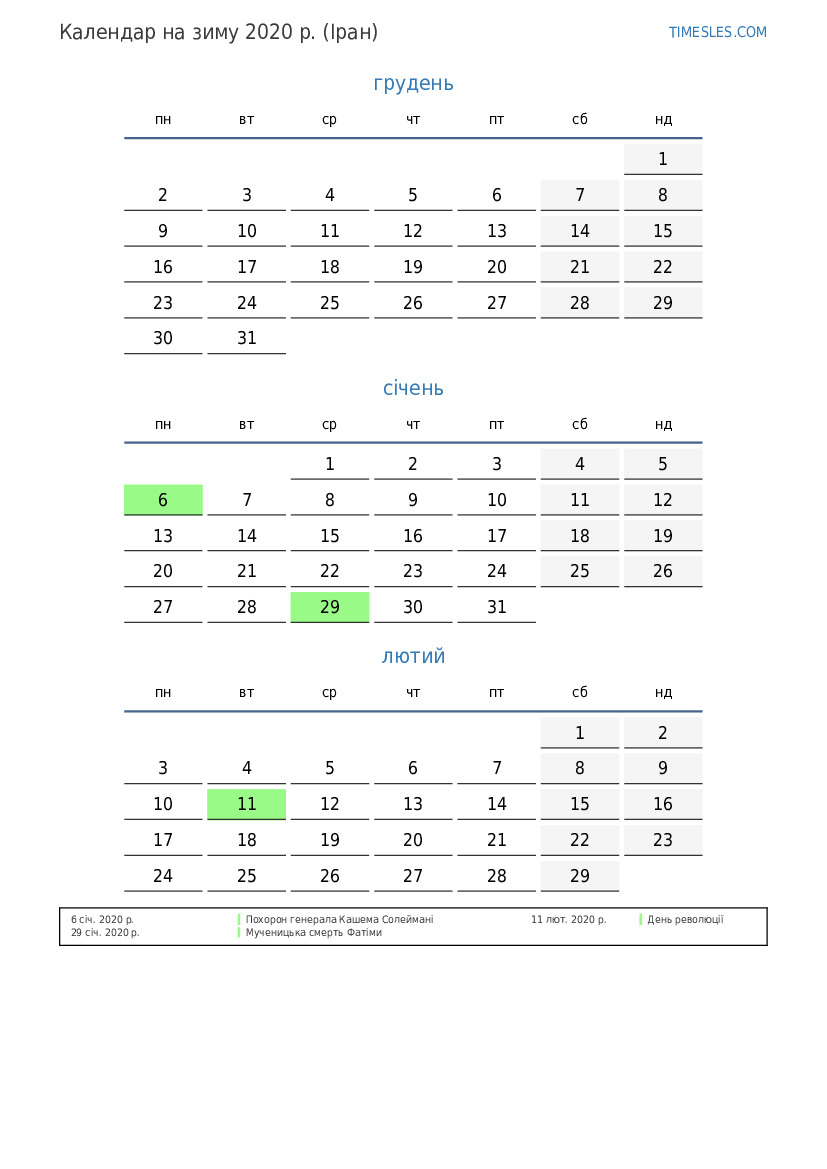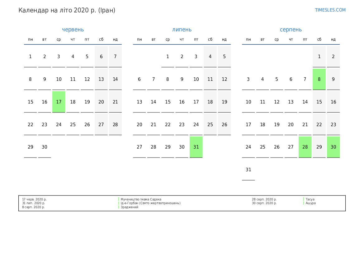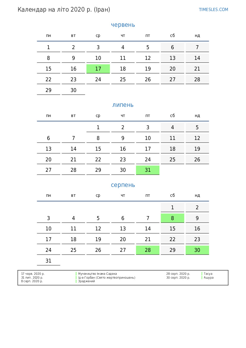 Завантажте та роздрукуйте календар PDF зі святами та вихідними на літо 2020 року для Ірану
