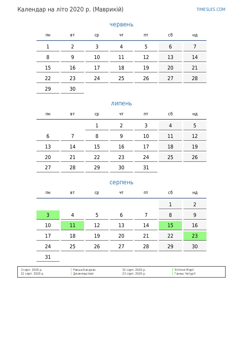 Завантажте та роздрукуйте календар PDF зі святами та вихідними на літо 2020 року для Маврикія