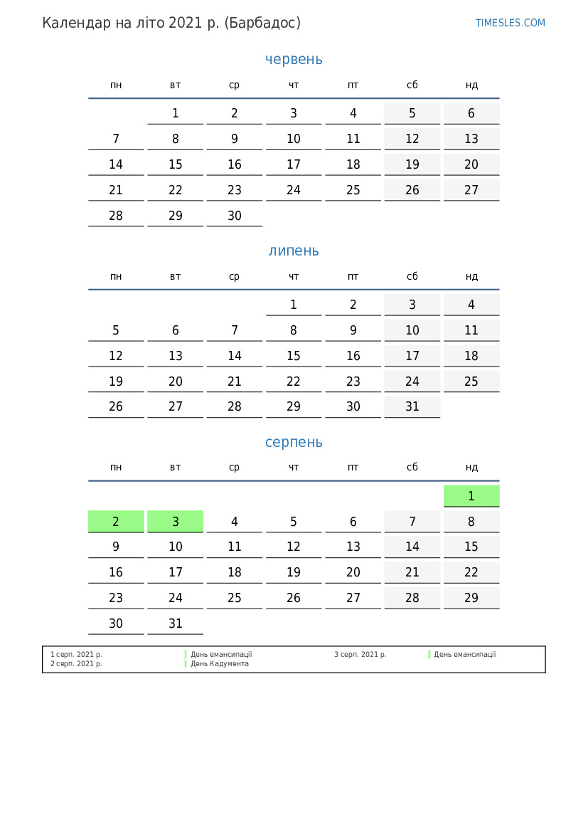 Календар на літо 2021 року для Барбадосу