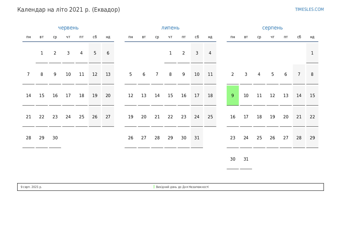 Календар на літо 2021 року для Еквадору