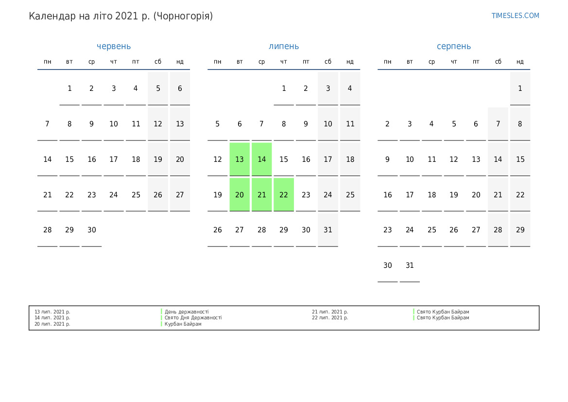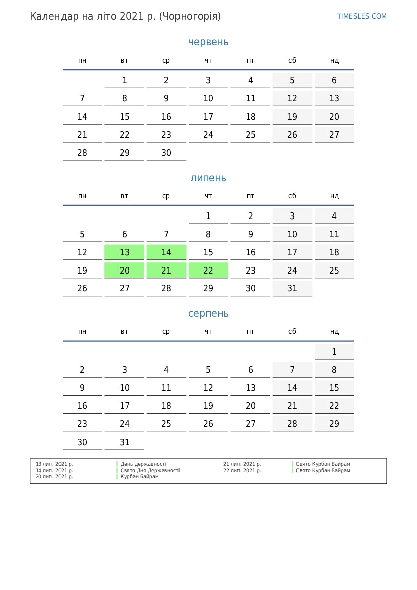 Завантажте та роздрукуйте календар PDF зі святами та вихідними на літо 2021 року для Чорногорії