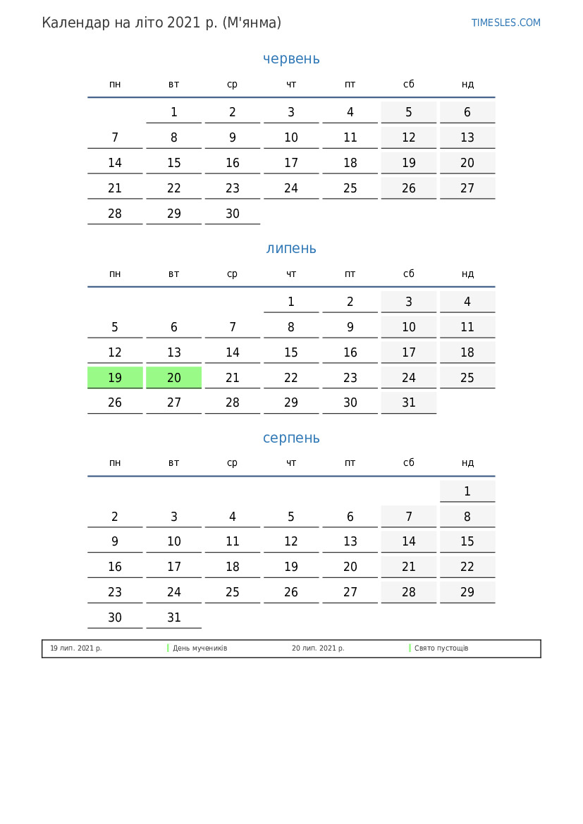 Завантажте та роздрукуйте календар PDF зі святами та вихідними на літо 2021 року для М’янми