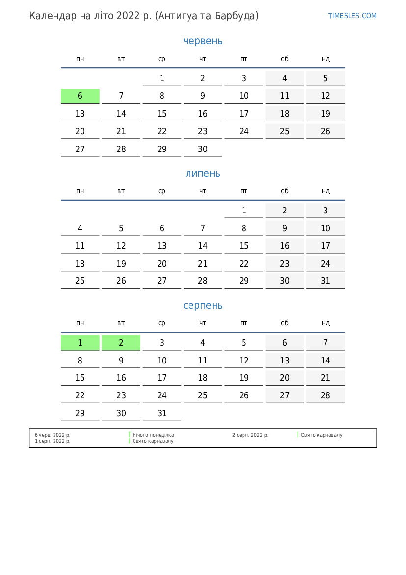 Календар свят і вихідних на літо 2022 року для Антигуа та Барбуди