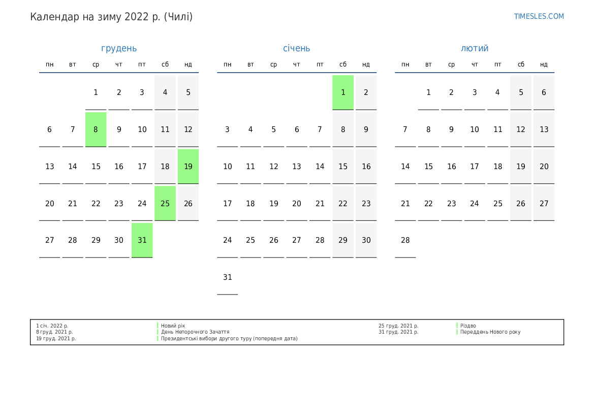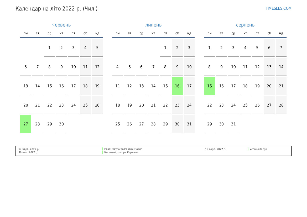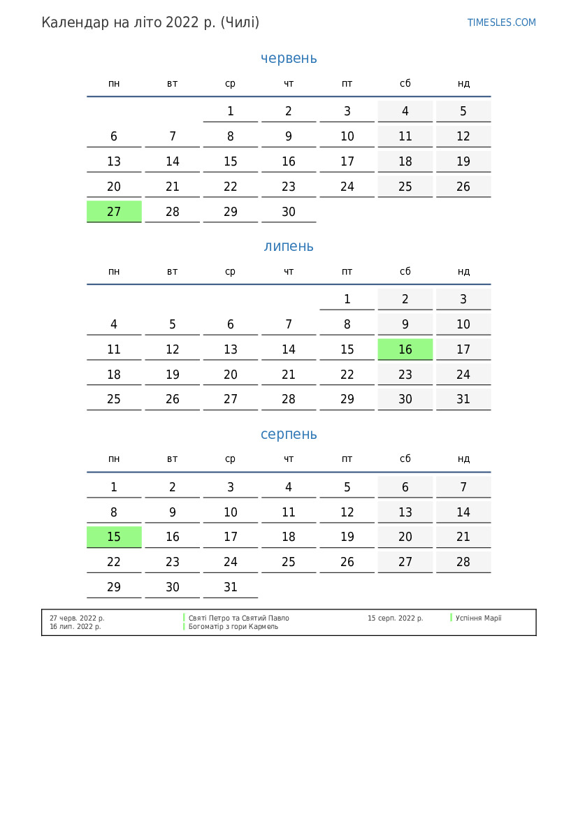 Завантажте та роздрукуйте календар PDF зі святами та вихідними на літо 2022 року для Чилі