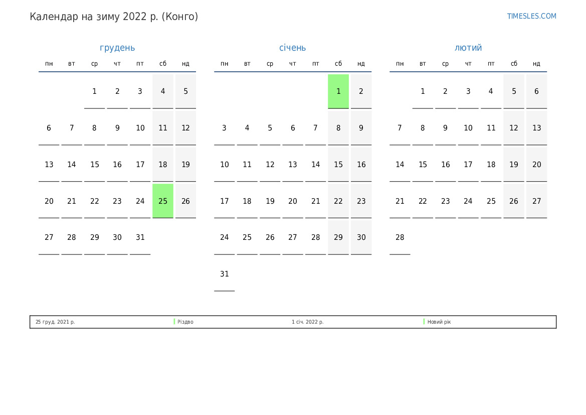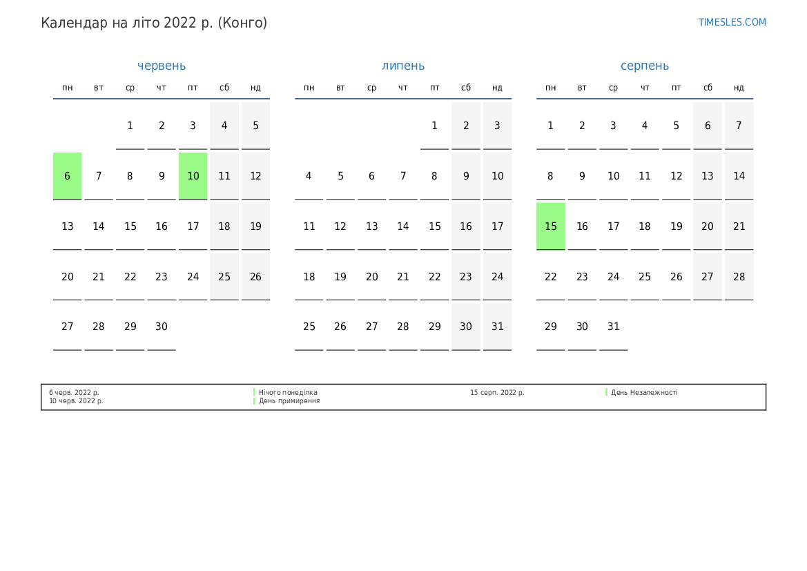 Завантажте та роздрукуйте календар PDF зі святами та вихідними на літо 2022 року для Конго