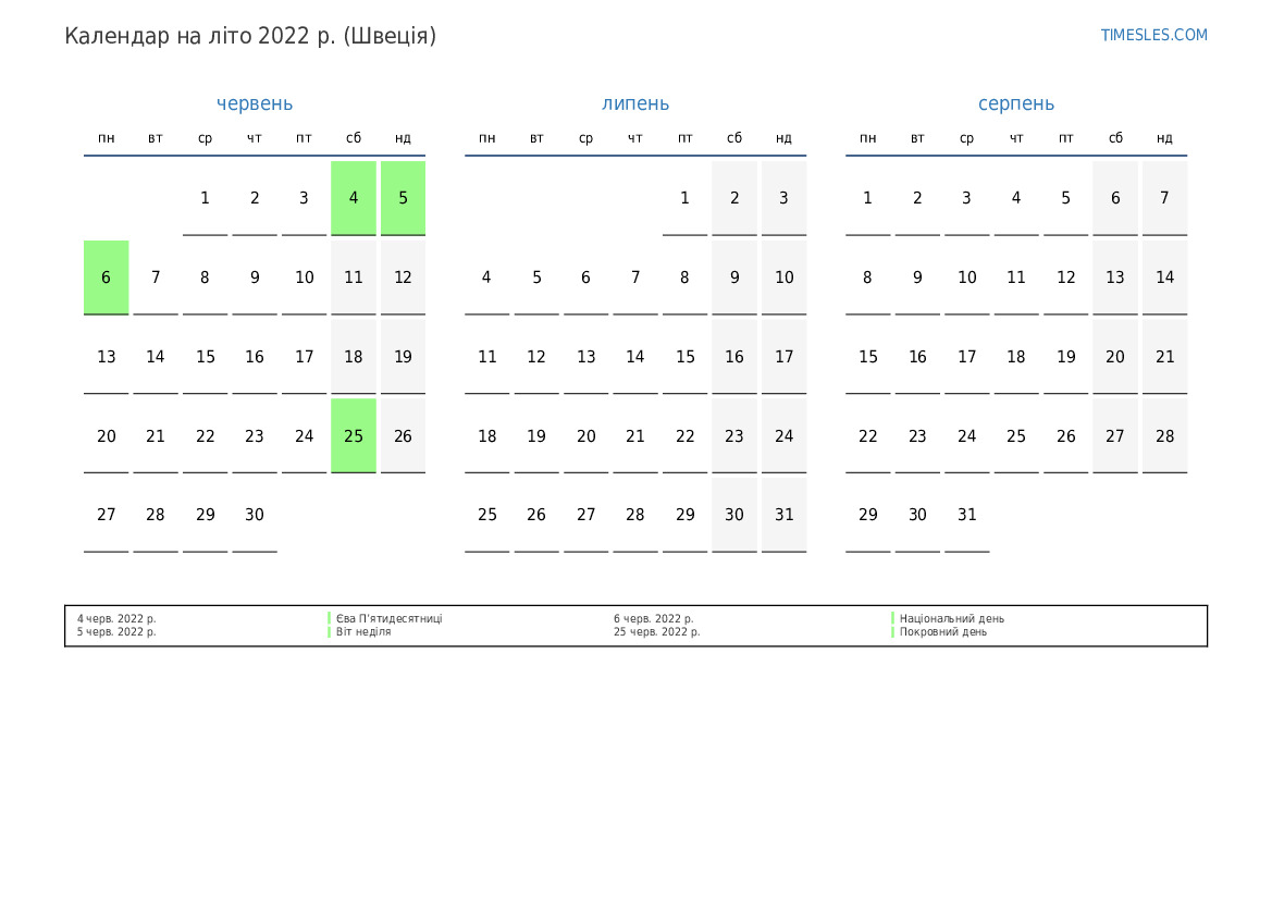 Завантажте та роздрукуйте календар PDF зі святами та вихідними на літо 2022 року для Швеції