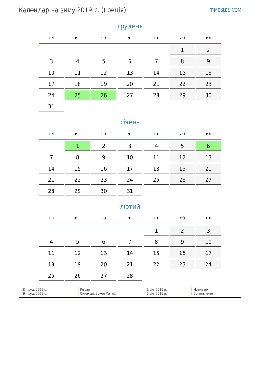 Завантажте та роздрукуйте календар PDF зі святами та вихідними на зиму 2019 року для Греції