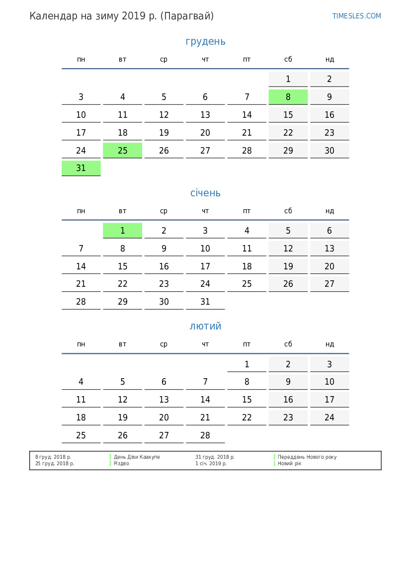 Завантажте та роздрукуйте календар PDF зі святами та вихідними на зиму 2019 року для Парагваю