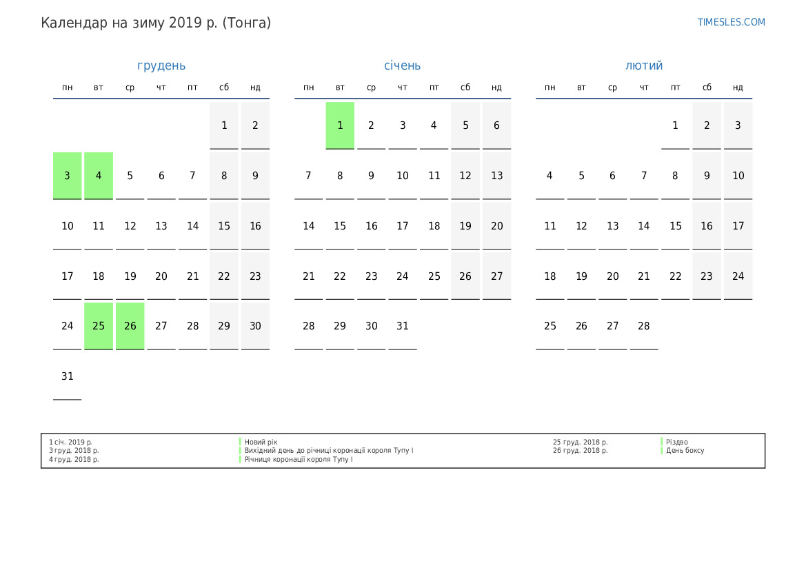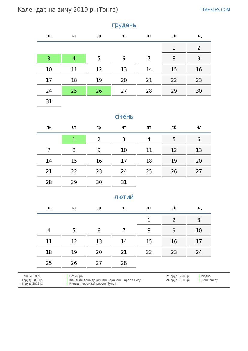 Завантажте та роздрукуйте календар PDF зі святами та вихідними на зиму 2019 року для Тонги