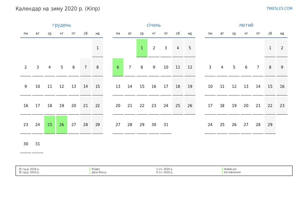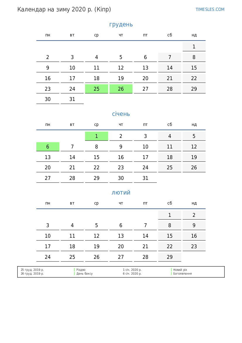 Завантажте та роздрукуйте календар PDF зі святами та вихідними на зиму 2020 року для Кіпру