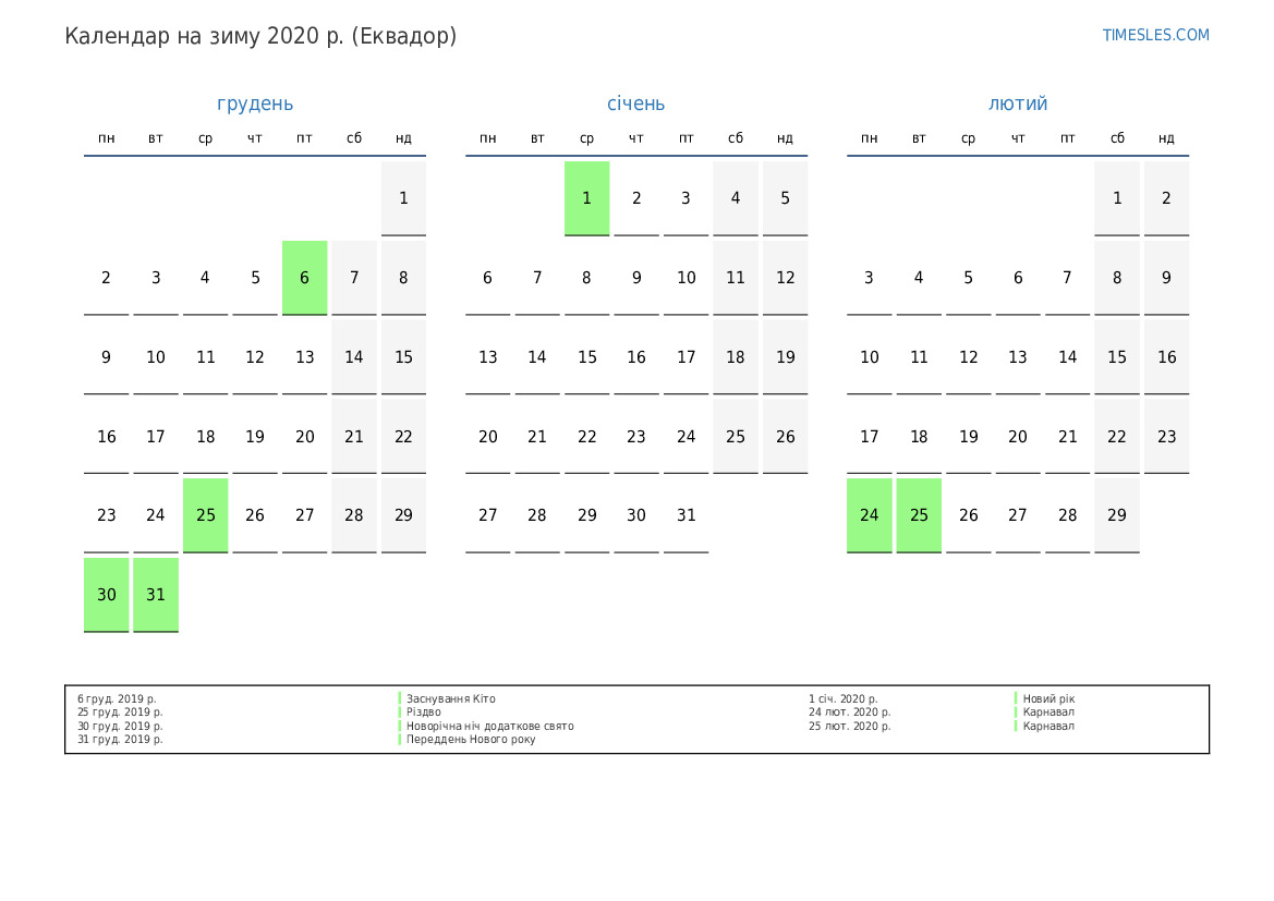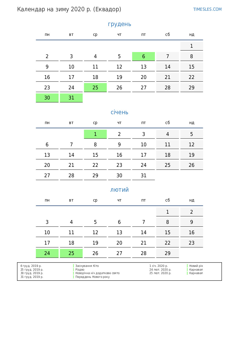 Завантажте та роздрукуйте календар PDF зі святами та вихідними на зиму 2020 року для Еквадору