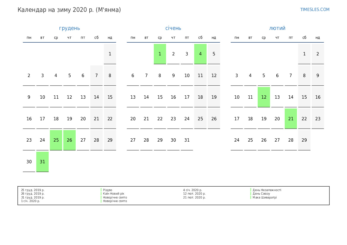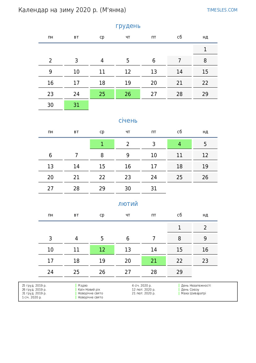 Завантажте та роздрукуйте календар PDF зі святами та вихідними на зиму 2020 року для М’янми