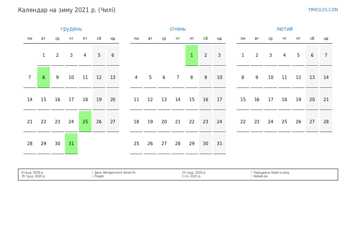 Завантажте та роздрукуйте календар PDF зі святами та вихідними на зиму 2021 року для Чилі