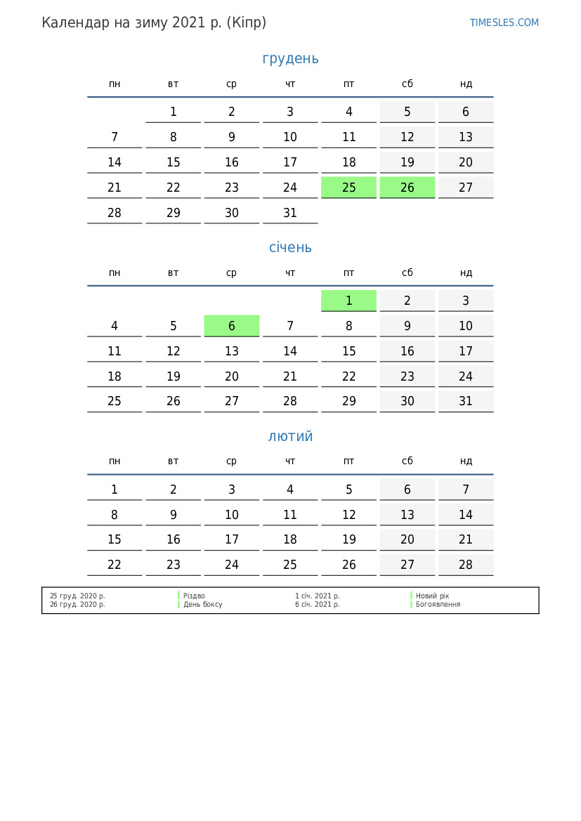 Завантажте та роздрукуйте календар PDF зі святами та вихідними на зиму 2021 року для Кіпру