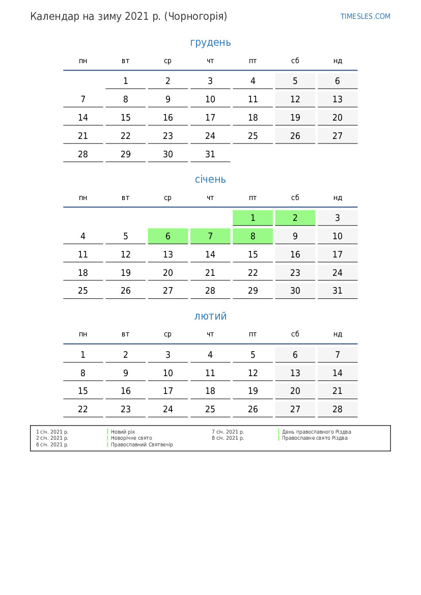 Завантажте та роздрукуйте календар PDF зі святами та вихідними на зиму 2021 року для Чорногорії