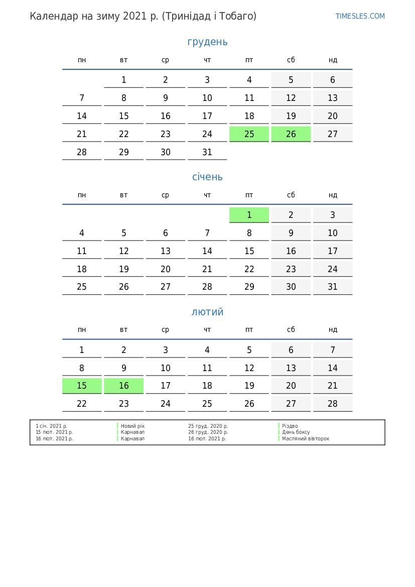 Календар на зиму 2021 року для Тринідаду та Тобаго