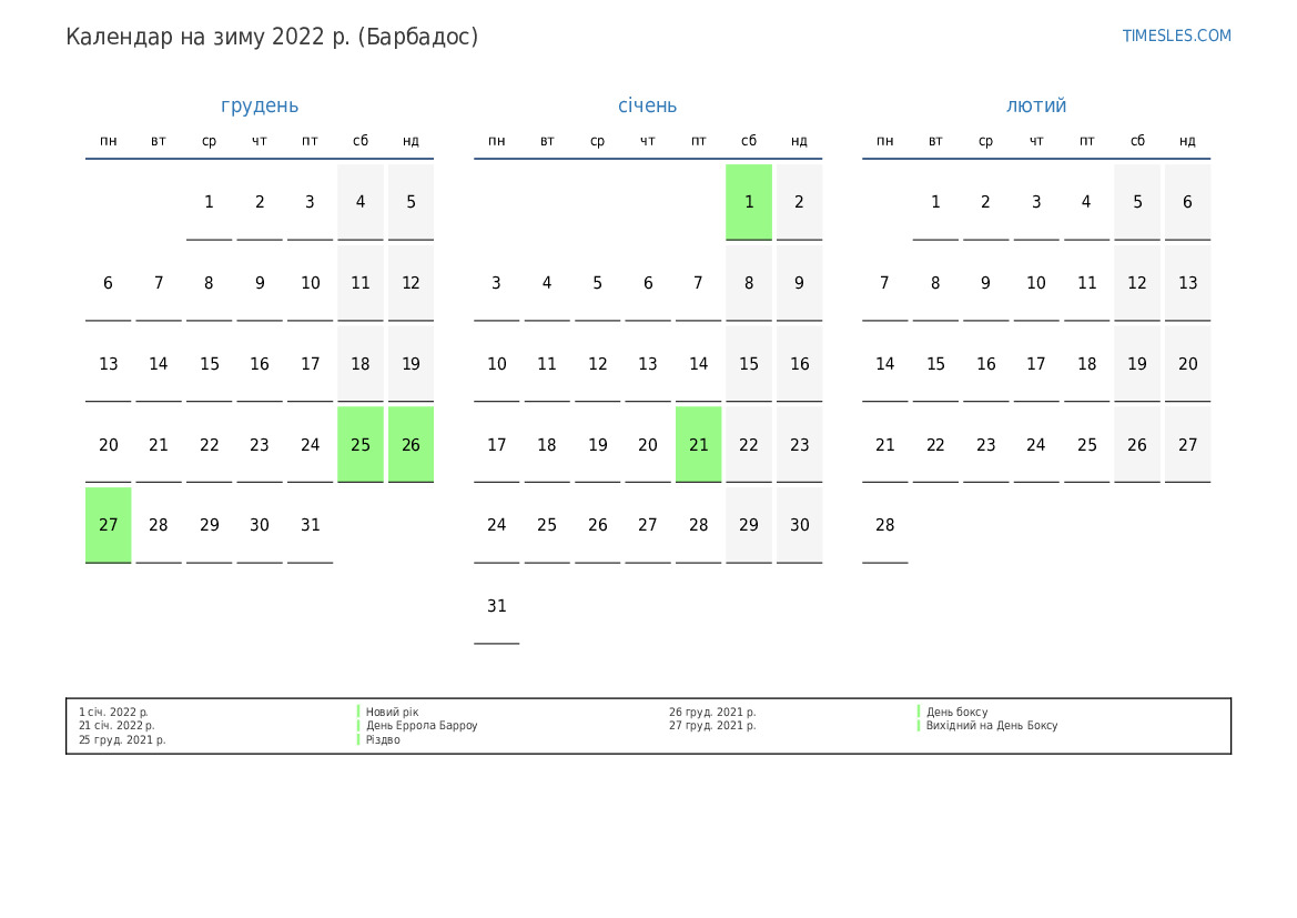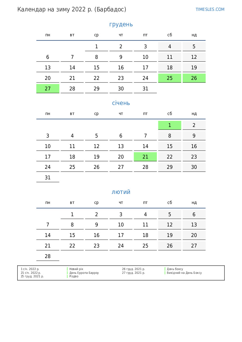 Календар на зиму 2022 року для Барбадосу