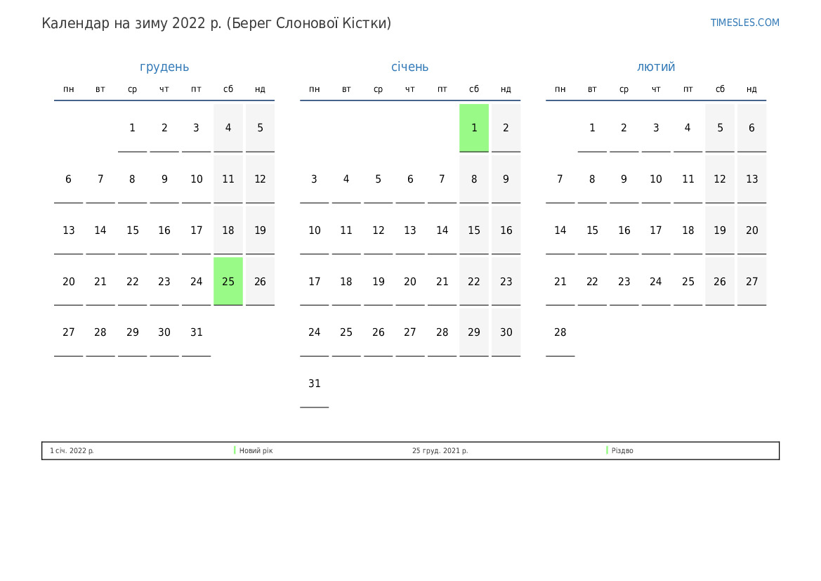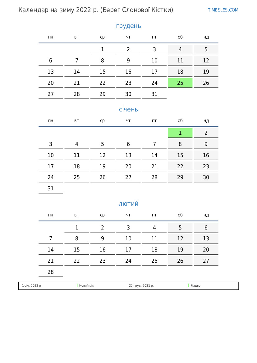 Завантажте та роздрукуйте календар PDF зі святами та вихідними на зиму 2022 року для Кот-д'Івуару