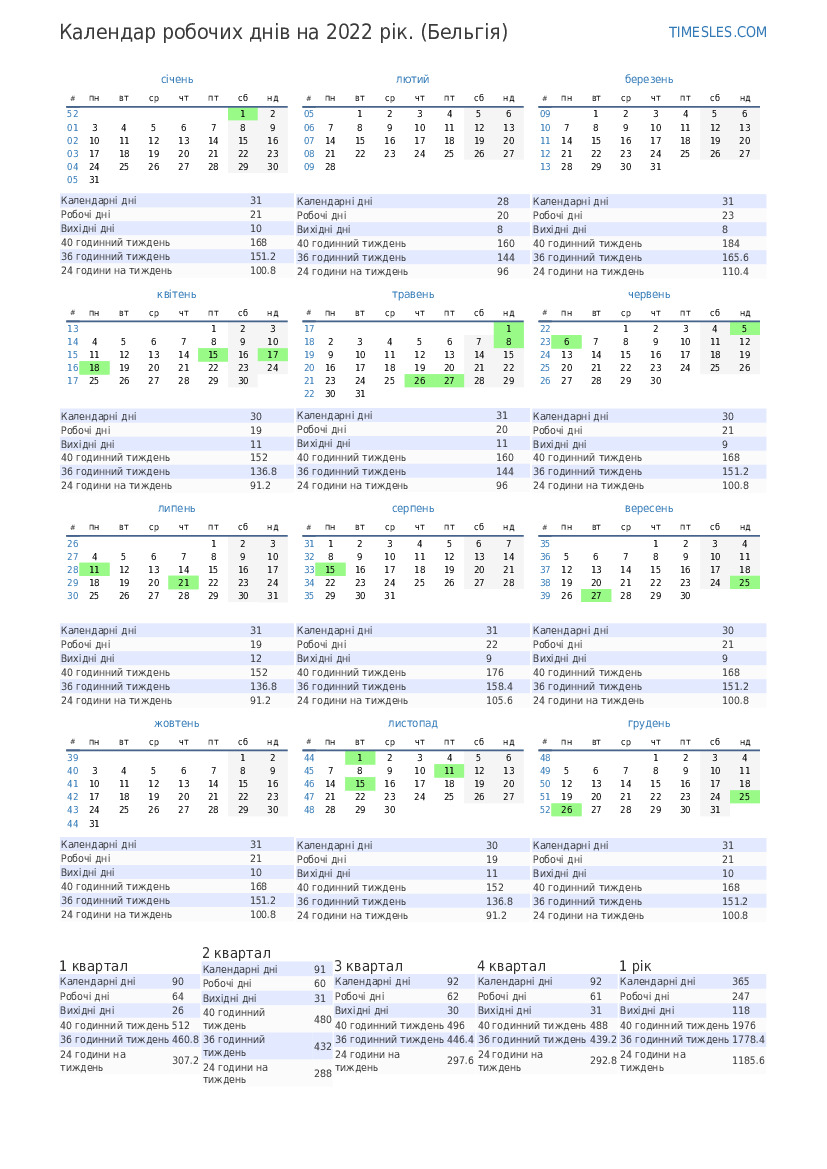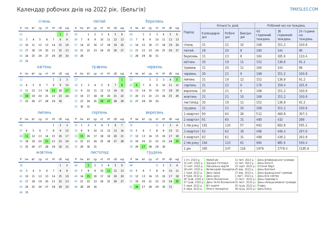 Робочі дні на липень 2022 року для Бельгії