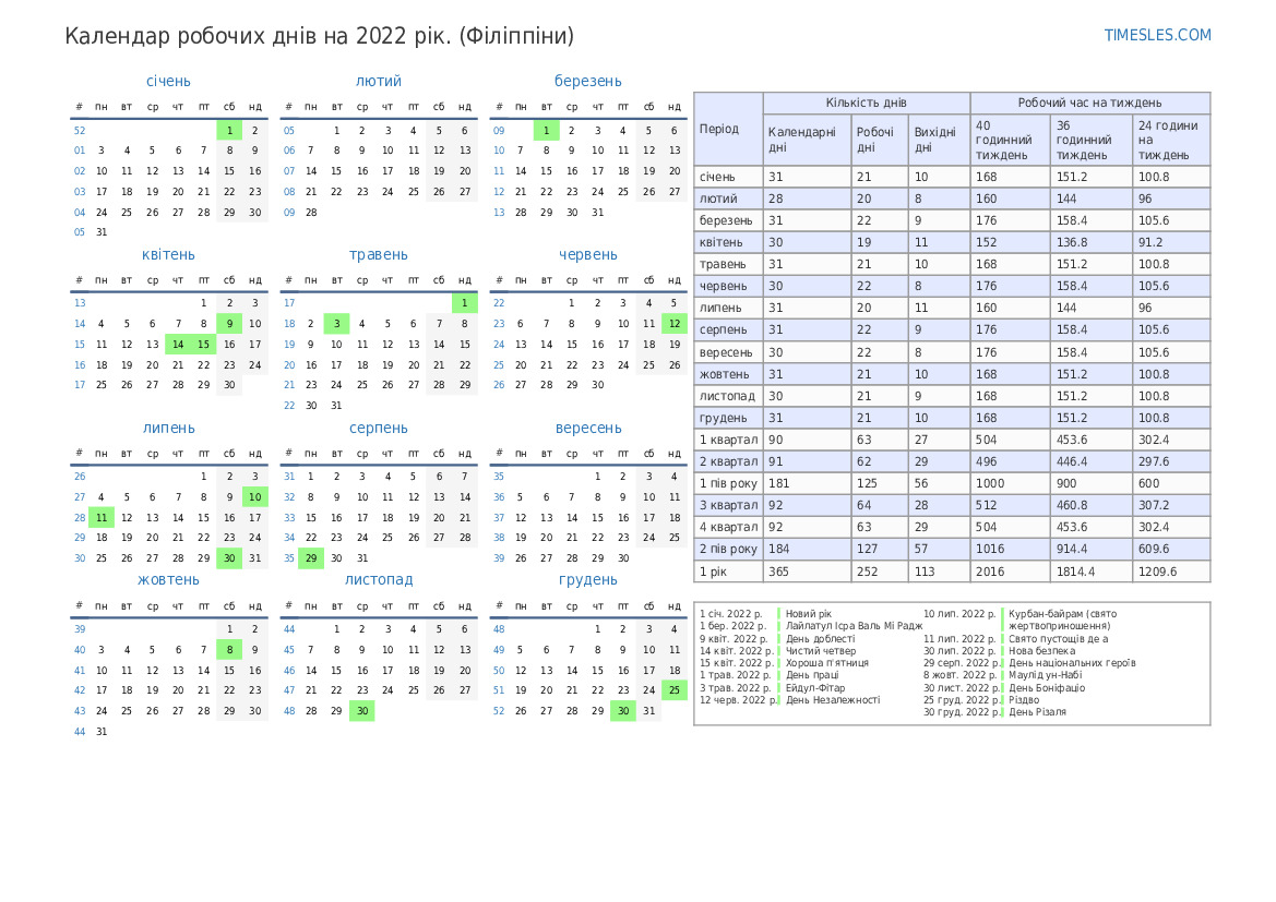 Завантажте та роздрукуйте календар робочих днів у форматі PDF на липень 2022 року для Філіппін