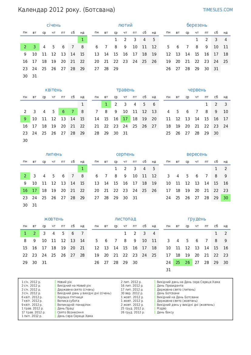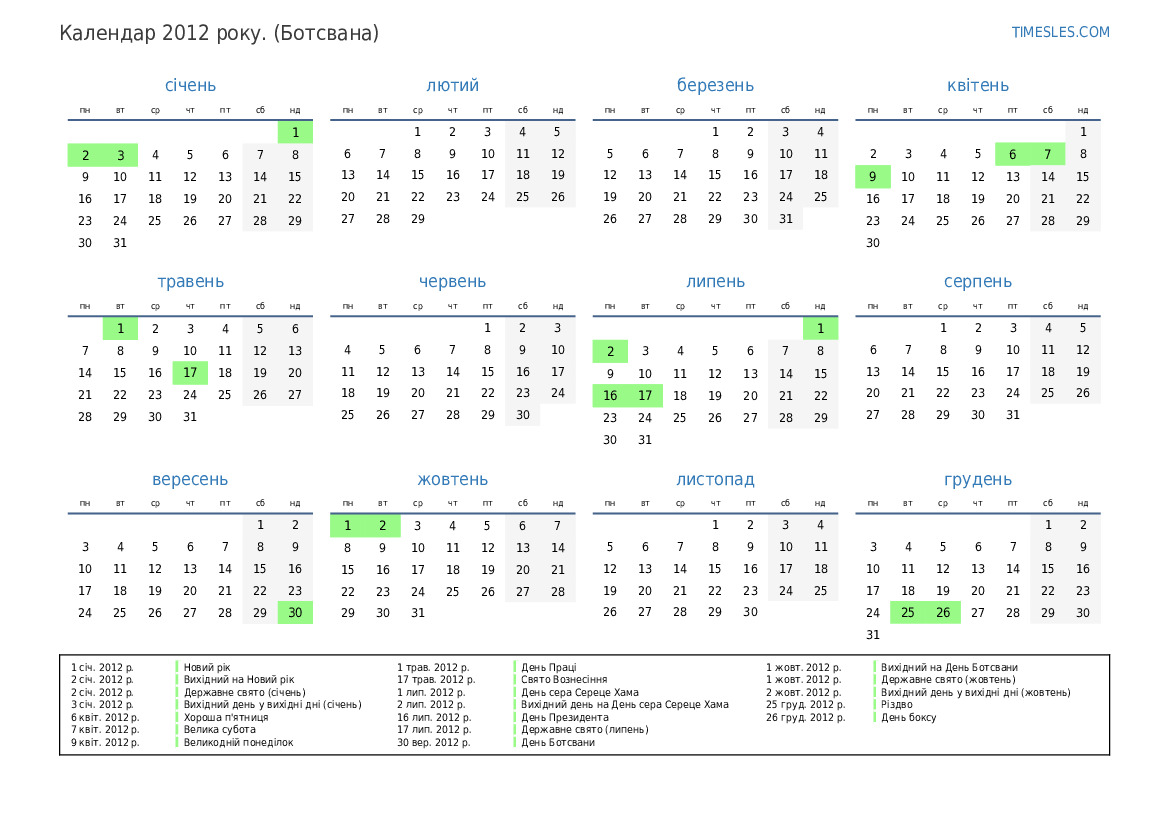 1 жовт. 2012 р. Вихідний на День Ботсвани