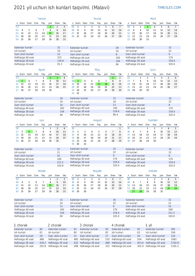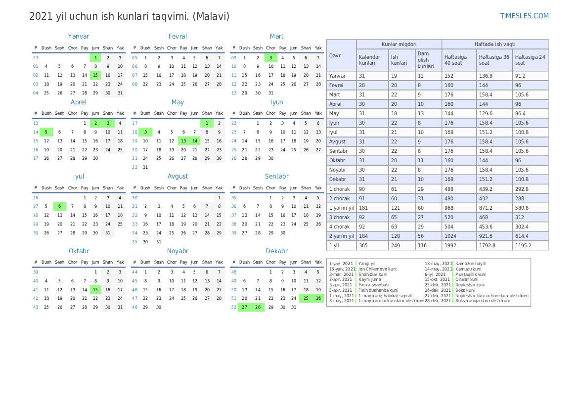 Malavi uchun 2021 yil Aprel uchun ta'til va dam olish kunlari bilan ish kunlari taqvimi