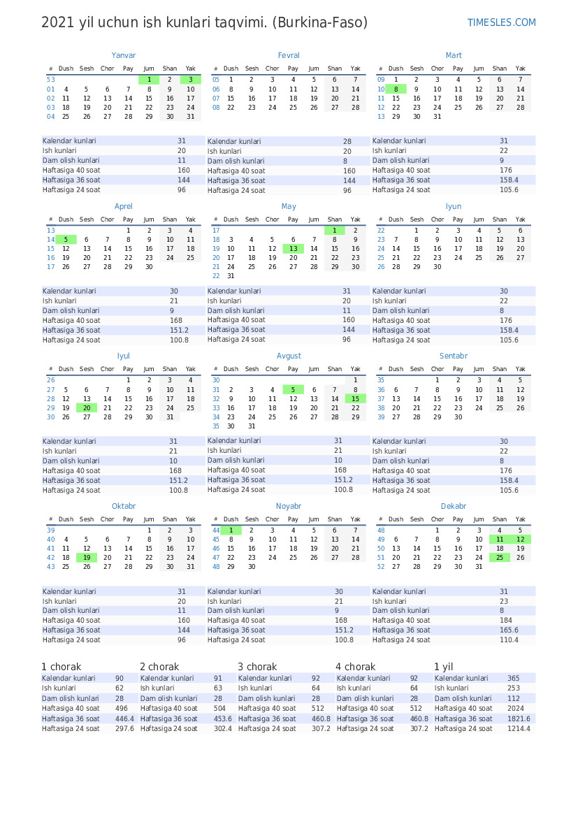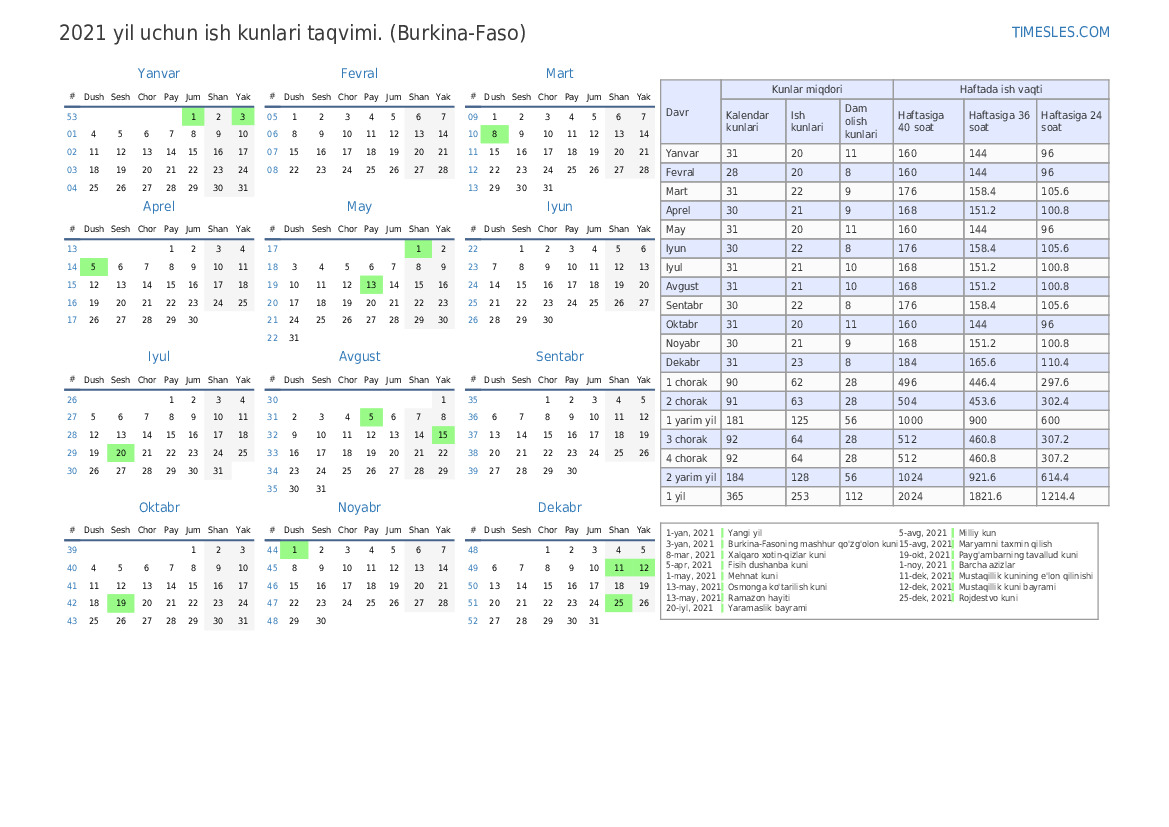 2021 yil May kunlari haftalar bilan ish kunlari taqvimi. Besh kunlik ish haftasi. Burkina-Fasoda 2021 yil May oyida 3 ta'til va dam olish kunlari mavjud. Ish vaqti va ta'tilni keyinga qoldiradigan taqvim.