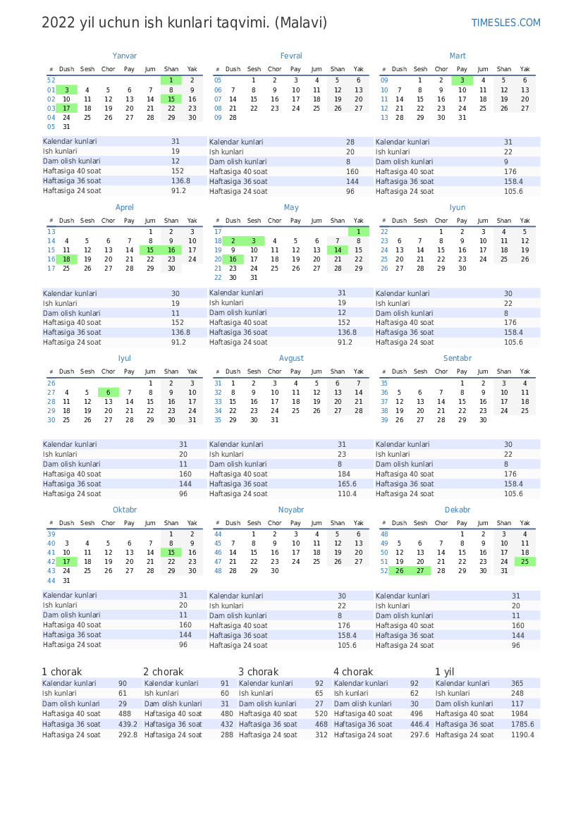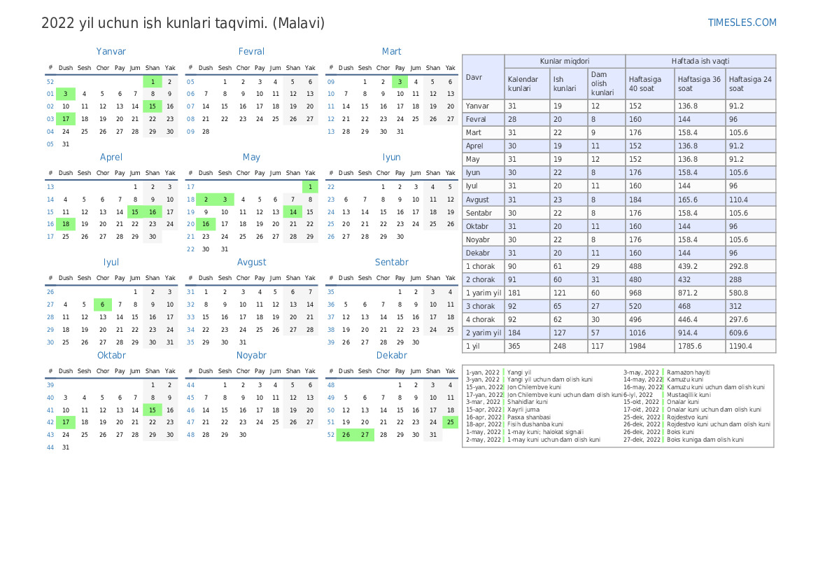 Malavi uchun 2022 yil Aprel uchun ta'til va dam olish kunlari bilan ish kunlari taqvimi