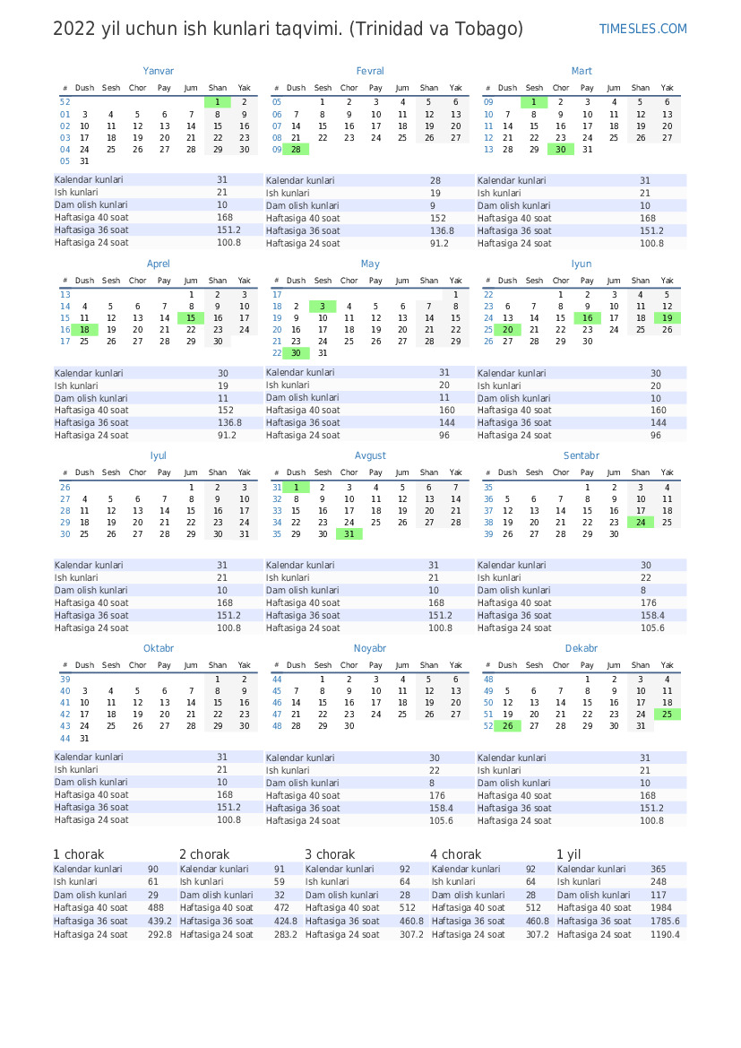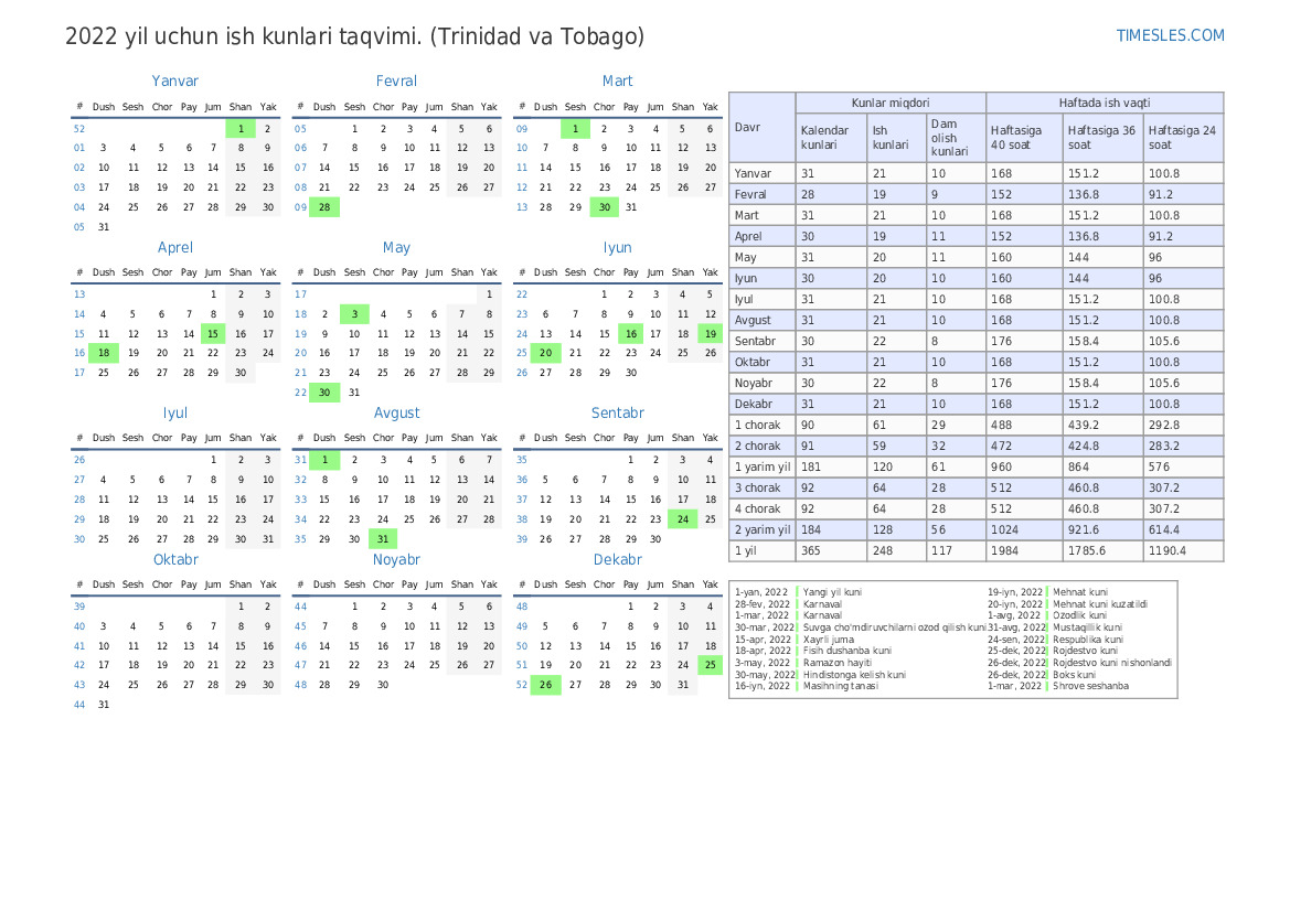 Trinidad va Tobago uchun Oktabr 2022 ish kun kalendar