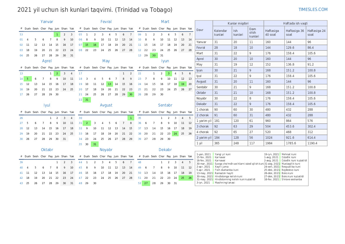 Trinidad va Tobago uchun 2021 yil 4-choragi uchun ta'til va dam olish kunlari bilan ish kunlari taqvimi