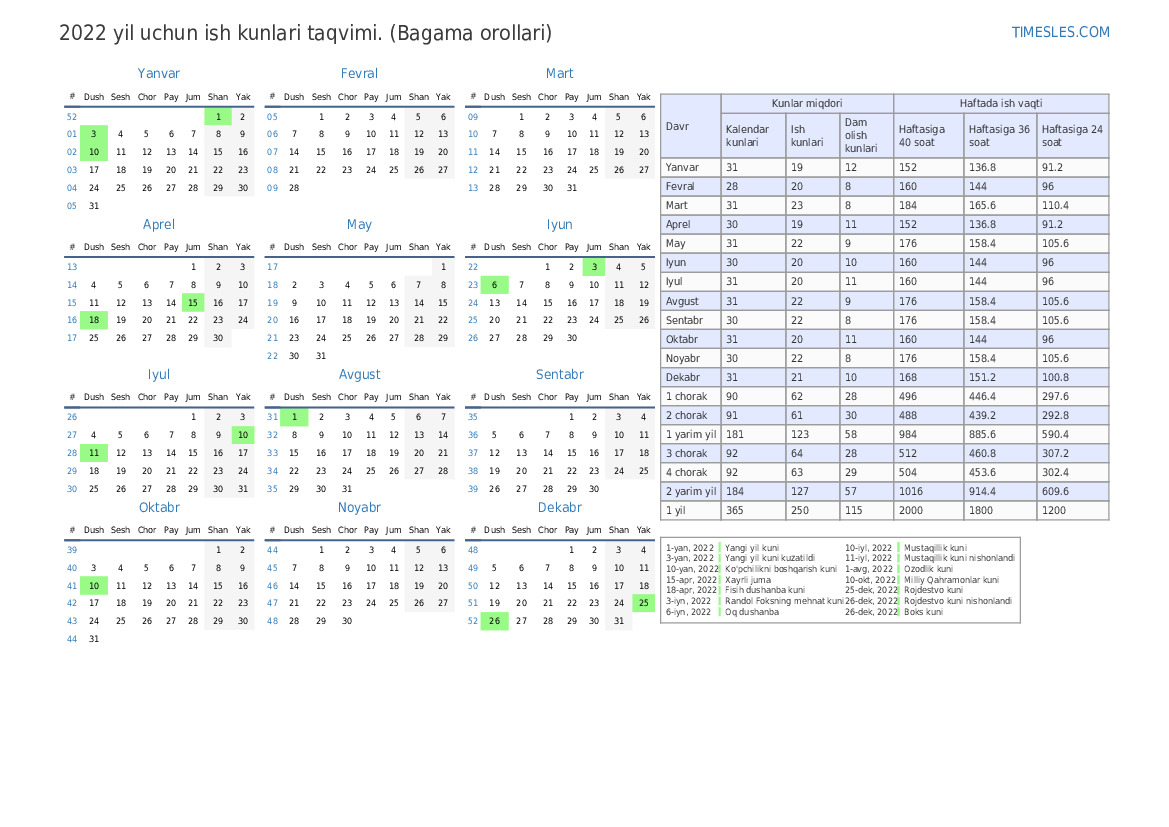Bagama orollari uchun 2022 yil 1-choragi uchun ta'til va dam olish kunlari bilan ish kunlari taqvimi