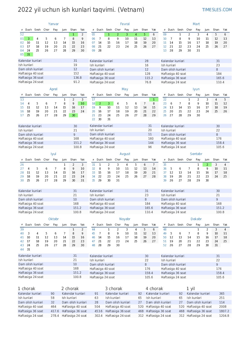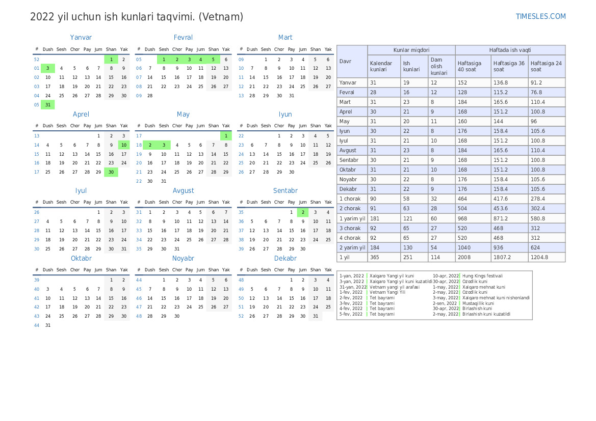 Vetnam uchun 2022 yil 1-choragi uchun ta'til va dam olish kunlari bilan ish kunlari taqvimi